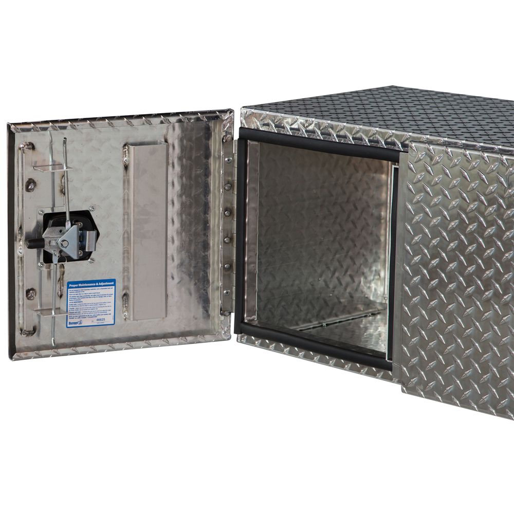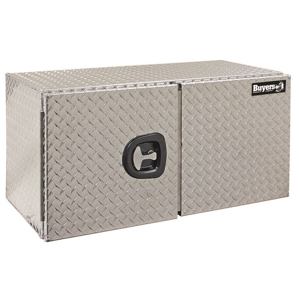 This heavy-duty aluminum underbody toolbox from Buyers Products is the easiest way to transport and access your tools and supplies when you need them the most. The barn door-style double swing-out doors provide superior access to the box without a bulky center post to get in the way. Its three-point, die cast compression system includes a lock and provides the ultimate in security when you're away from your truck. Aluminum construction with a tough diamond plate pattern ensures that your box won't corrode or rust and the built-in rain gutter utilizes a bulb seal for added protection against moisture and road grime. Just select 18" and 24" welded aluminum brackets (available separately) to accommodate any size toolbox and truck frame.