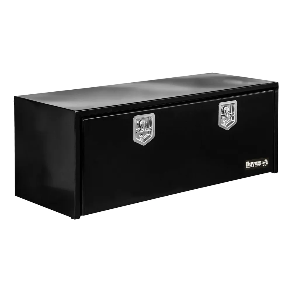 Secure and protect your most valuable tools and supplies with this steel drop door toolbox from Buyers Products. All-over powder coating on a 14 gauge steel box, along with a reinforced 12 gauge steel drop door, makes this toolbox sturdy and secure. A replaceable gasket seal and hidden hinge ensures that your box will remain weather-tight for years to come. The stainless steel T-latch locks for added protection and aircraft-grade cables ensure that, when open, the door will keep from falling flat against the bottom of the box. Purchase your choice of mounting brackets separately to ensure that you have the right materials to weld or bolt the box to your trailer underbody.