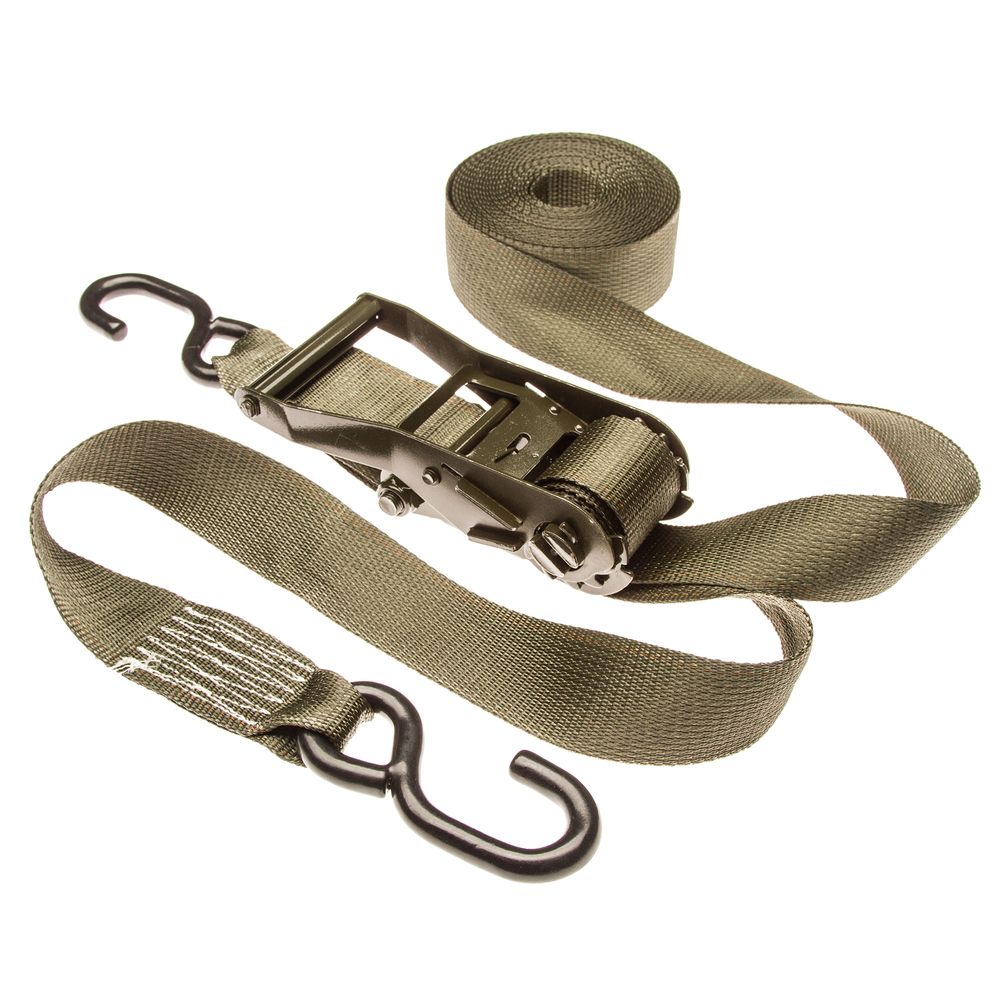 The 2" x 27' ratchet straps are designed to secure heavy loads to semis, flatbeds, box trucks, and more. The straps have a break strength of 4,400 lbs. and a working load limit of 1,467 lbs. When securing sharp objects, cushioning should always be used to prevent frays or rips to any ratchet strap. An S-hook makes securing objects easier when access to anchor points are tight or limited. The flat shape of the S-hook makes securing object easier by fitting into the hard-to-reach anchor points while the J-hook counterpart may be too bulky to fit into tight areas or anchor points. An Army green powder coat is applied to the metal ratchet while the end S-hooks are wrapped in a protective vinyl coating.