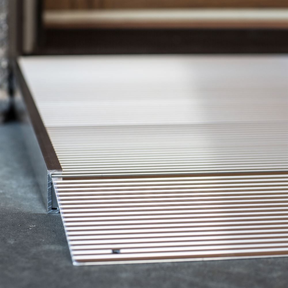 With an innovative adjustable design, the 1' EZ-ACCESS ® TRANSITIONS ® Aluminum Threshold Ramp is especially helpful for locations where the surface may not be level. Manufactured from high-strength, lightweight aluminum, this ramp has a 700 lb. weight capacity and is extruded with texture for better traction. The self-supporting, adjustable legs have pivoting footpads to accommodate varying angles and surface types, as well as rises from 1.375" to 2.75" high.