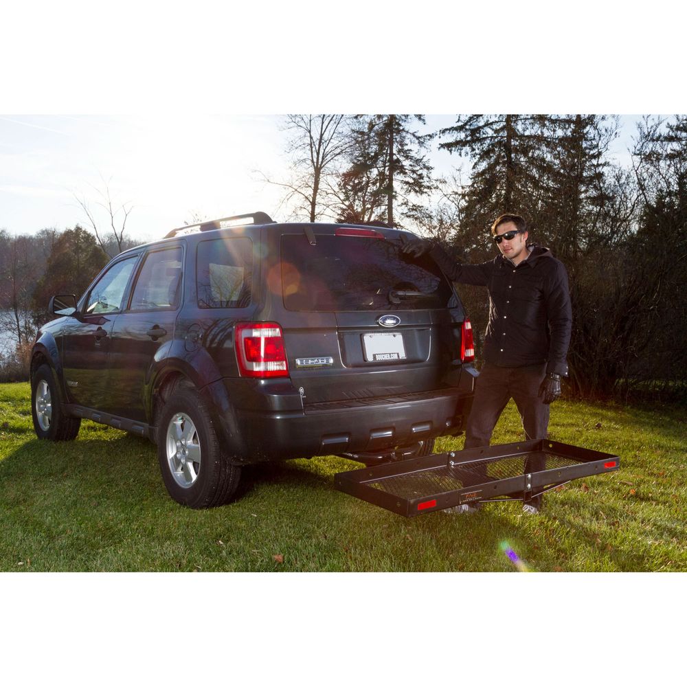 Haul up to 500 extra pounds of cargo with this 60" long steel tray cargo carrier from Apex, featuring an easy-to-mount design that makes it a perfect solution for hauling lawn equipment, hunting supplies, camping gear, and so much more. Pre-drilled holes on the sides make it easy to attach a cargo net or tie down straps for safe and secure transport. When not in use, the tray flips up against the back of your vehicle for easy, out-of-the-way transport.