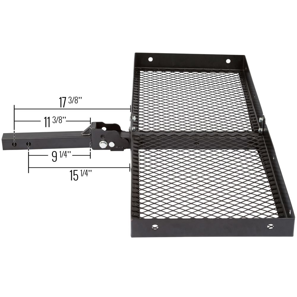 The hitch mounted folding cargo carrier adds that little extra space when you need it the most. The receiver hitch carrier features many securing points for use with cargo nets to keep your cargo to the cargo carrier. The folding cargo carrier can hold up to 500 lbs. and when not in use it can be folded up and out of your way. With a simple but yet sturdy design, this cargo carrier is a must have for camping trips or nearly any other excursion. When in use, the receiver hitch carrier is visible at night with two bright reflective strips attached on the back of the carrier. Dual support bars stabilize the cargo carrier when in transit.