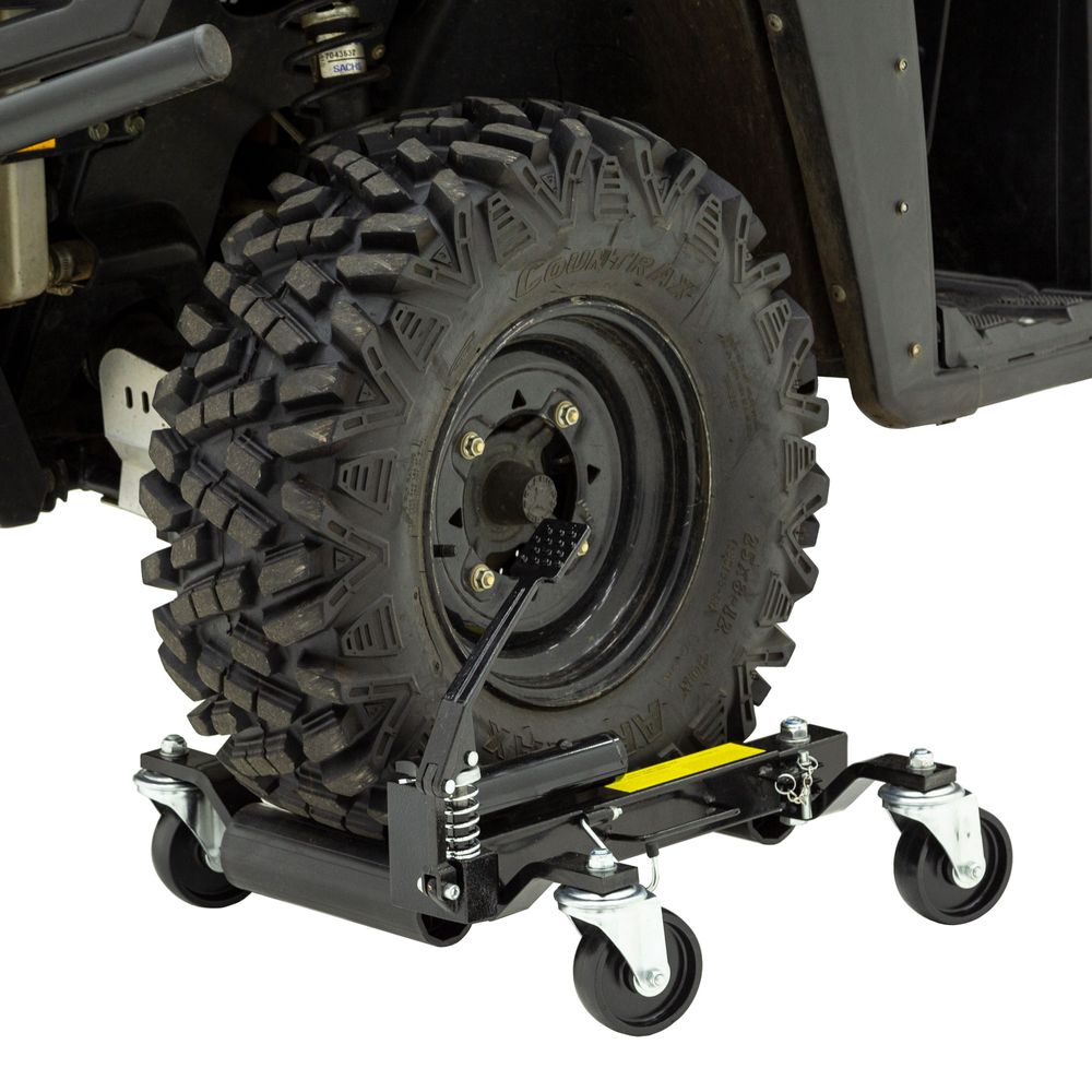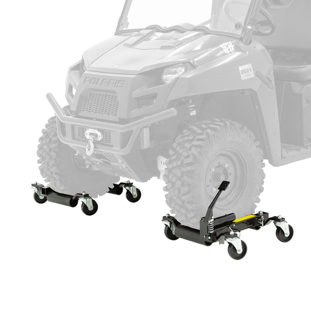 The Black Widow Wheel Dolly and Positioning Jack Two Pack helps to maneuver vehicles, ATVs and UTVs around garages, body shops, showrooms, parking garages and other level-surfaced area where space might be limited. Constructed of reinforced steel, each jack dolly has a black powder-coat finish and is designed with a hydraulic mechanism that allows the wheels to compact inwards while they lift the tire up to 4-1/4" off the ground. Each positioning jack can support up to 1,500 pounds per wheel, and two are required to move a vehicle by non-braking wheels. A safety locking pin holds the dollies in lifted position while moving, and foot pedals on each unit have a locking hook for added safety. Integrated carrying handles makes them easy to move around your space.