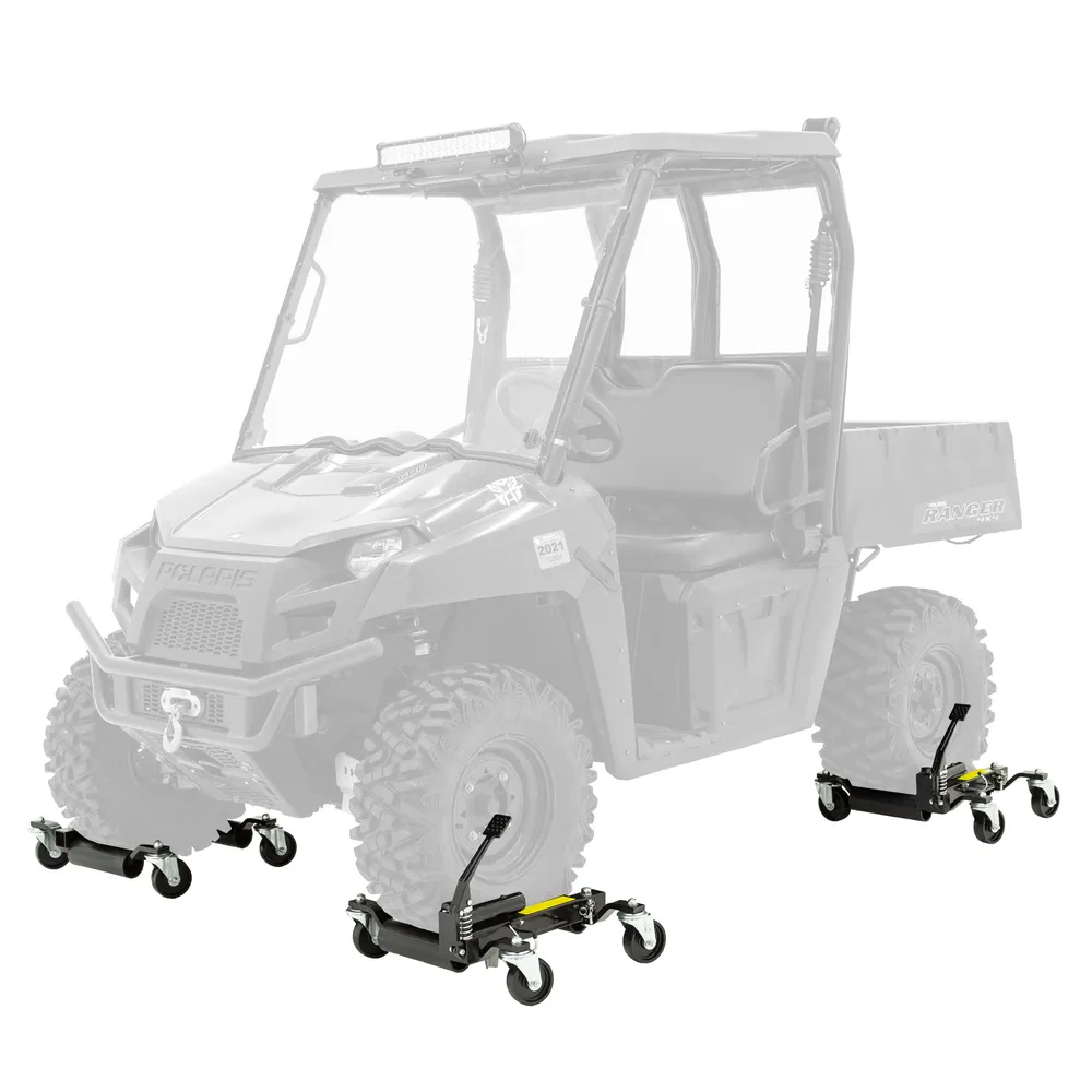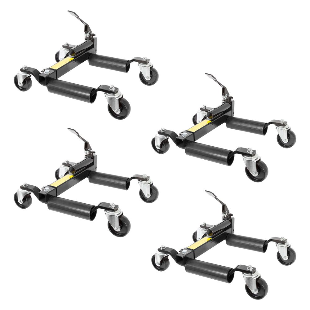 The Black Widow Wheel Dolly and Positioning Jack Four Pack helps to maneuver vehicles, ATVs and UTVs around garages, body shops, showrooms, parking garages and other level-surfaced area where space might be limited. Constructed of reinforced steel, each jack dolly has a black powder-coat finish and is designed with a hydraulic mechanism that allows the wheels to compact inwards while they lift the tire up to 4-1/4" off the ground. Each positioning jack can support up to 1,500 pounds per wheel, and two are required to move a vehicle by non-braking wheels. A safety locking pin holds the dollies in lifted position while moving, and foot pedals on each unit have a locking hook for added safety. Integrated carrying handles makes them easy to move around your space.