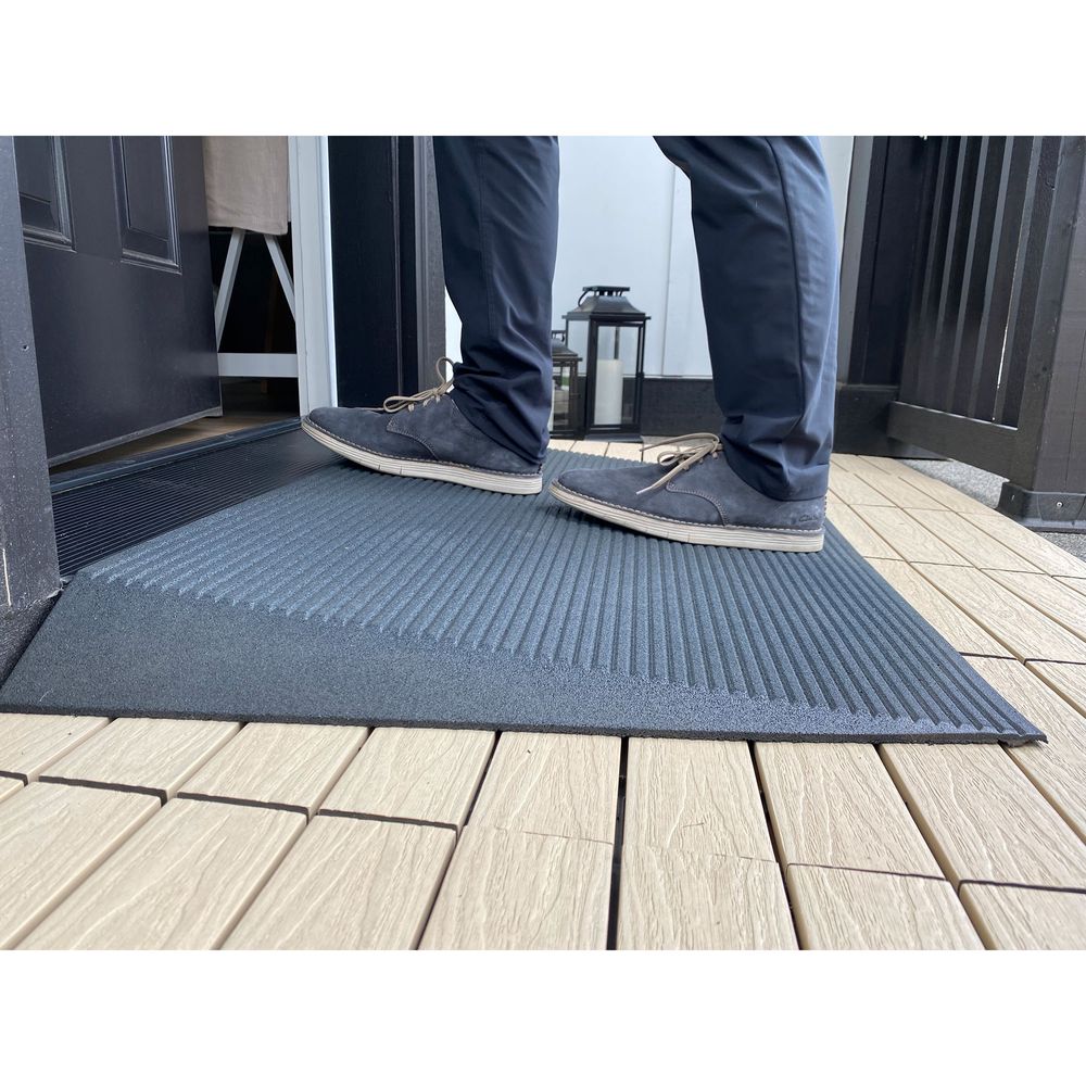 Provide a smooth, gradual transition from the ground to a doorway threshold with the 25 inch Storm Gray EZ-ACCESS ® TRANSITIONS ® Portable Rubber Threshold Ramp. Manufactured with 100% recycled rubber, this ramp has a large 850 pound weight capacity and comes with beveled sides, which makes it ideal for sliding glass doors because it will not interfere with the door track. This ramp can accommodate rises up to 2.5 inches high and has an integrated non-skid surface for maximum traction.