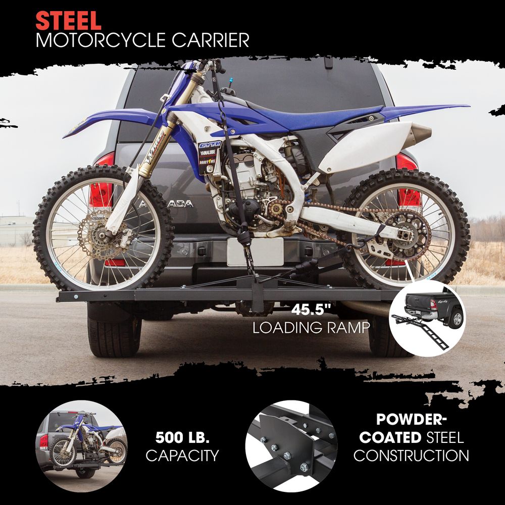 Haul your motorcycle, dirt bike, or scooter safely with this steel folding motorcycle carrier from Black Widow. Featuring heavy duty steel construction and a patented folding bracket, this carrier stores against your vehicle for easy maneuvering while not in use. Simply fold the carrier down and attach the self-storing loading ramp to either side of the carrier to easily hoist your bike to its desired position.