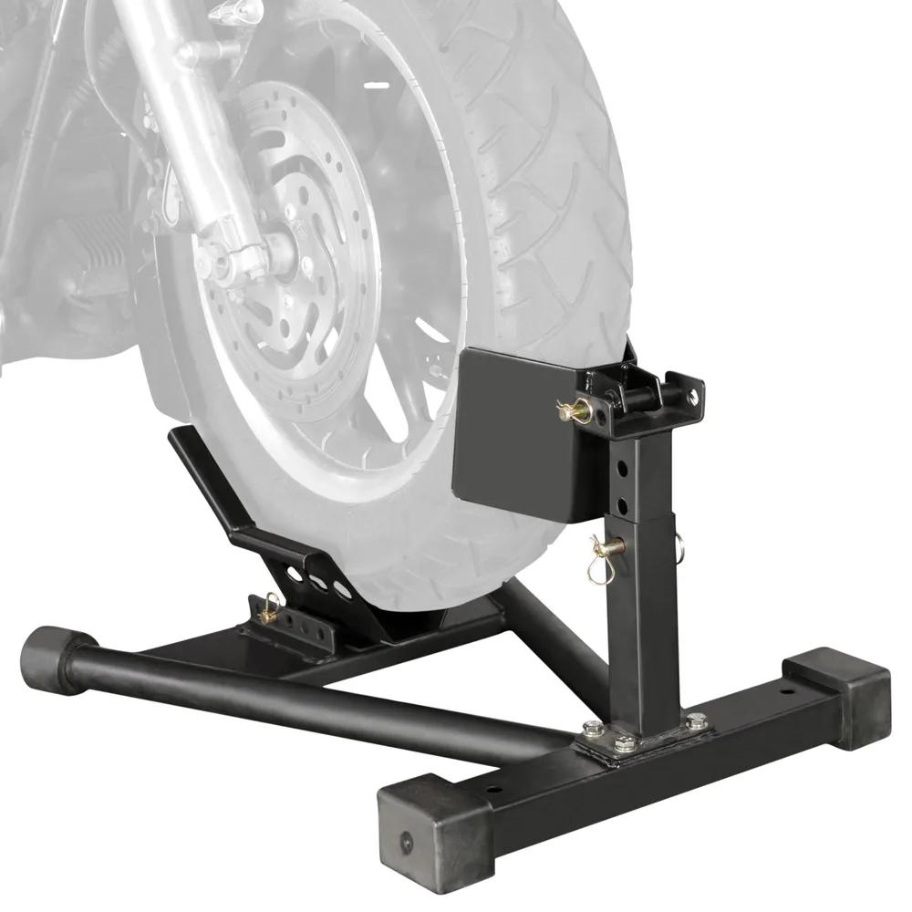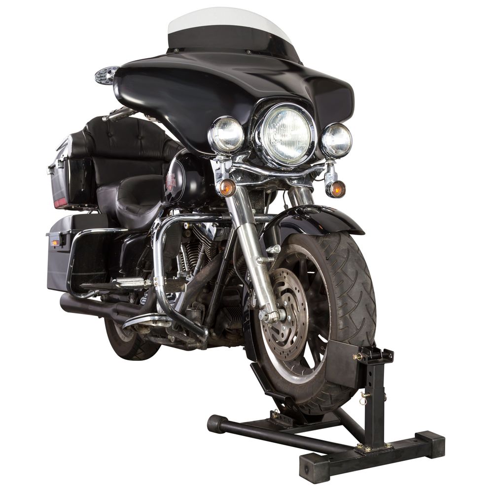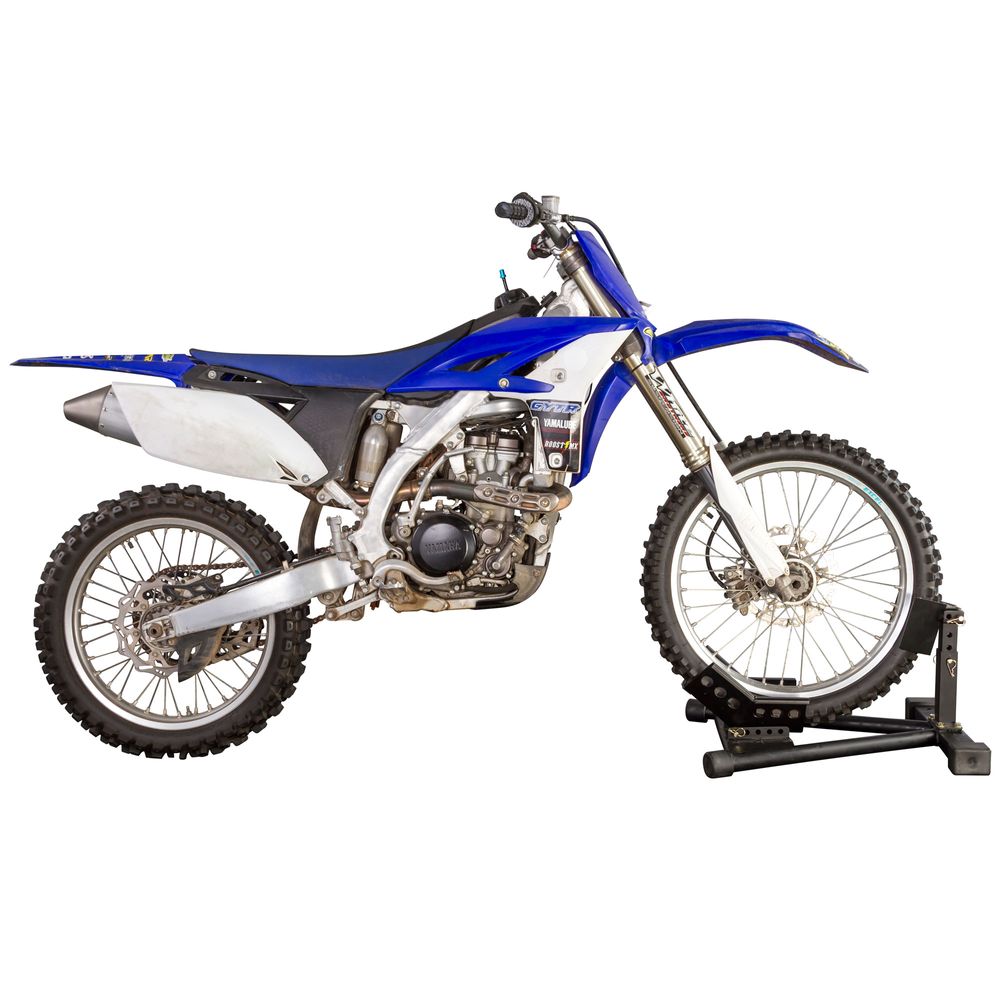 - The pivoting wheel stop can be adjusted into three height positions and has 7 different adjustments to accommodate almost any size motorcycle tire