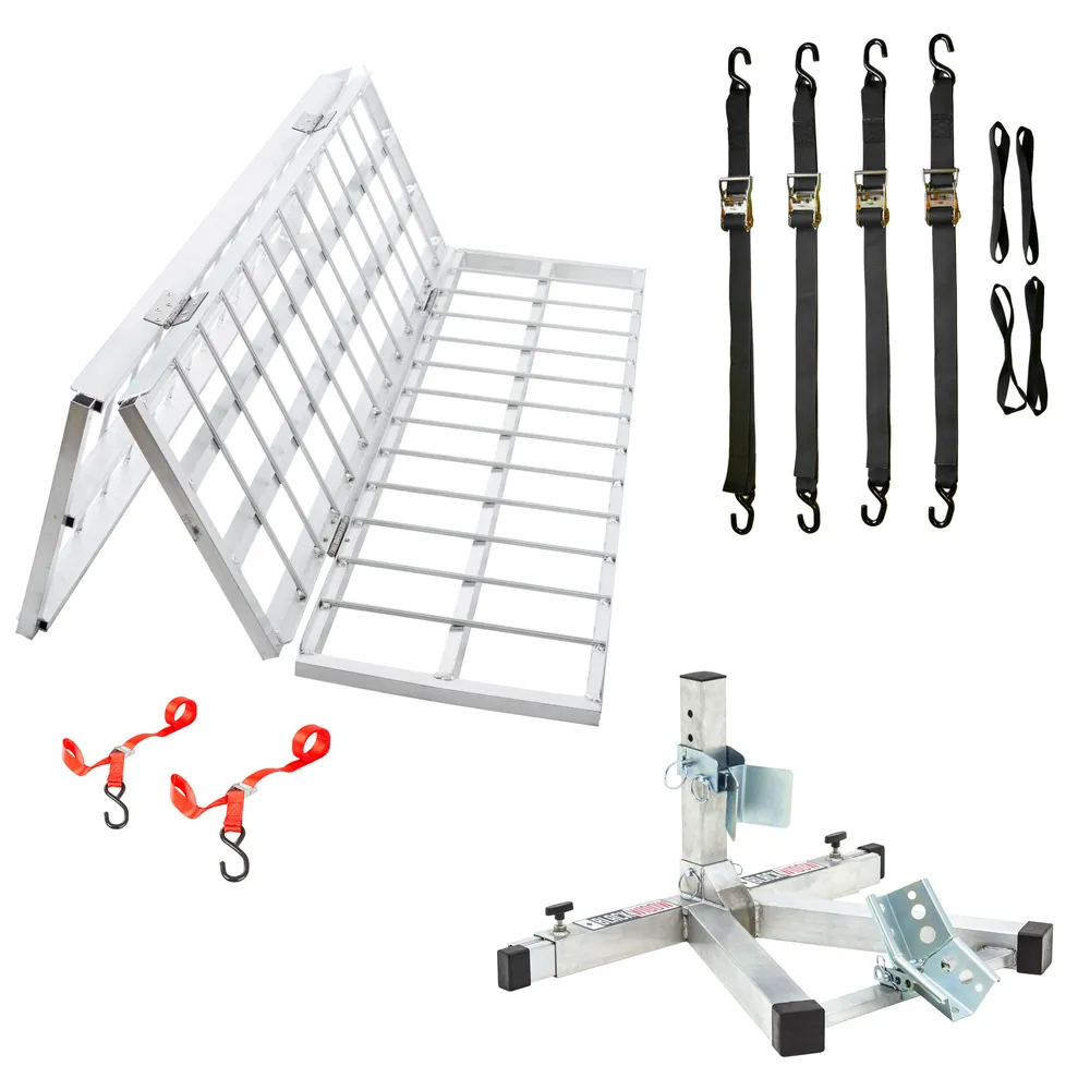 Designed specifically for use with motorcycle trailers, this Black Widow Transport Kit contains everything you need to safely and easily load, transport, and unload your motorcycle. The aluminum ramp is perfect for either enclosed or flatbed trailers, and will fold down to 16-5/8" wide and 6-3/8" thick for convenient transportation and storage. This kit also includes the innovative Black Widow wheel chock, which quickly installs into any truck or trailer bed up to 7' wide without the need for drilling, along with an eight piece 2" ratchet strap kit for securing your bike to the trailer.