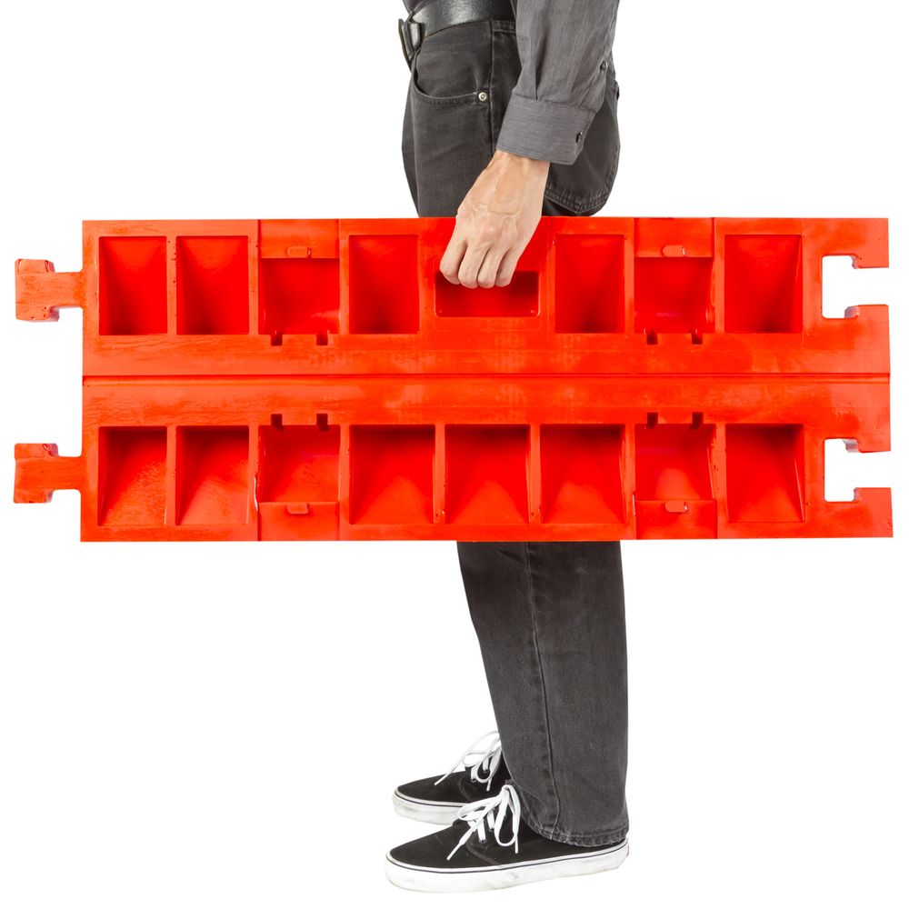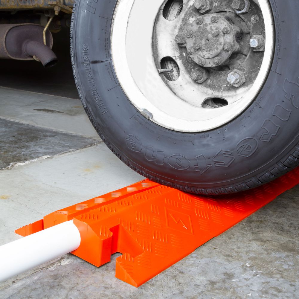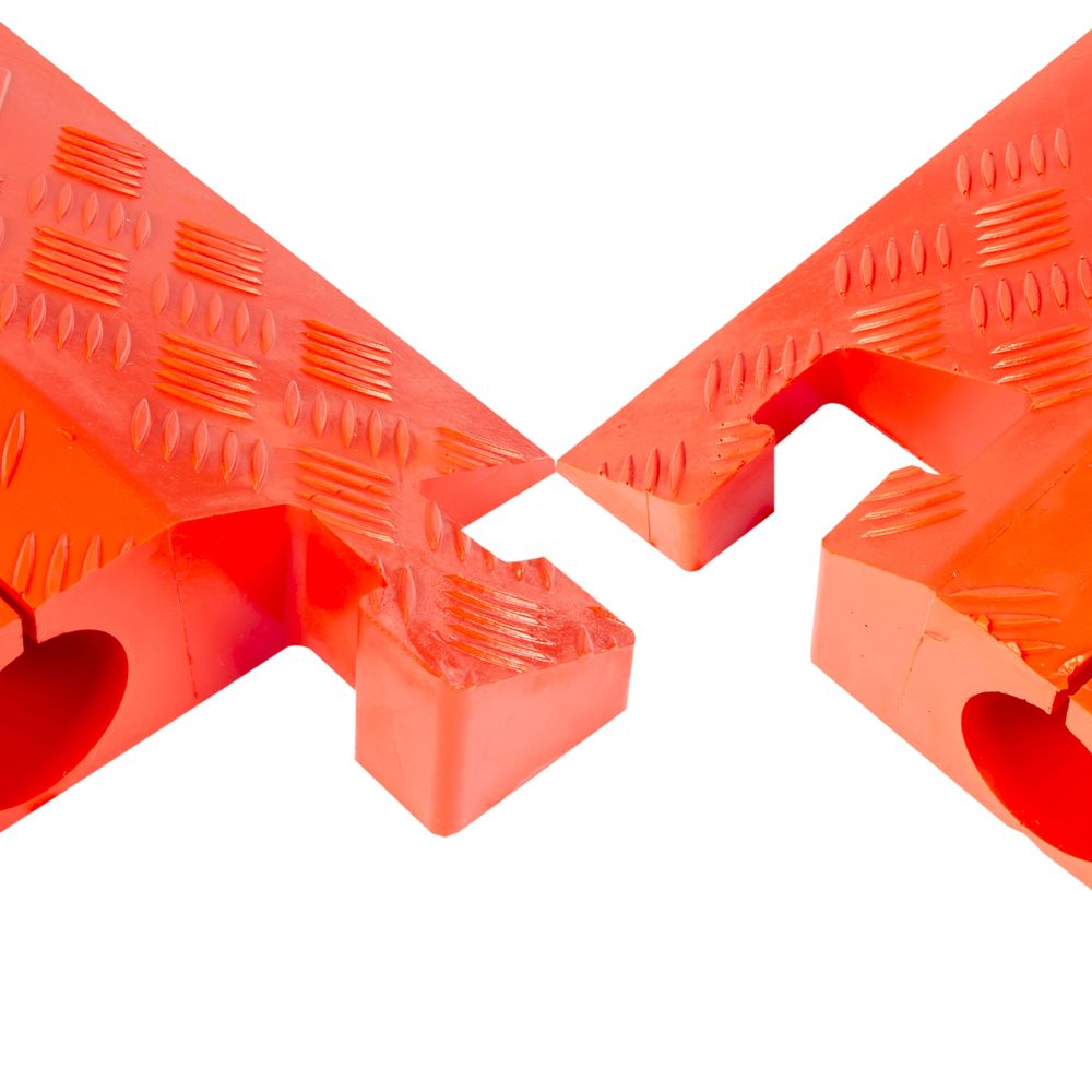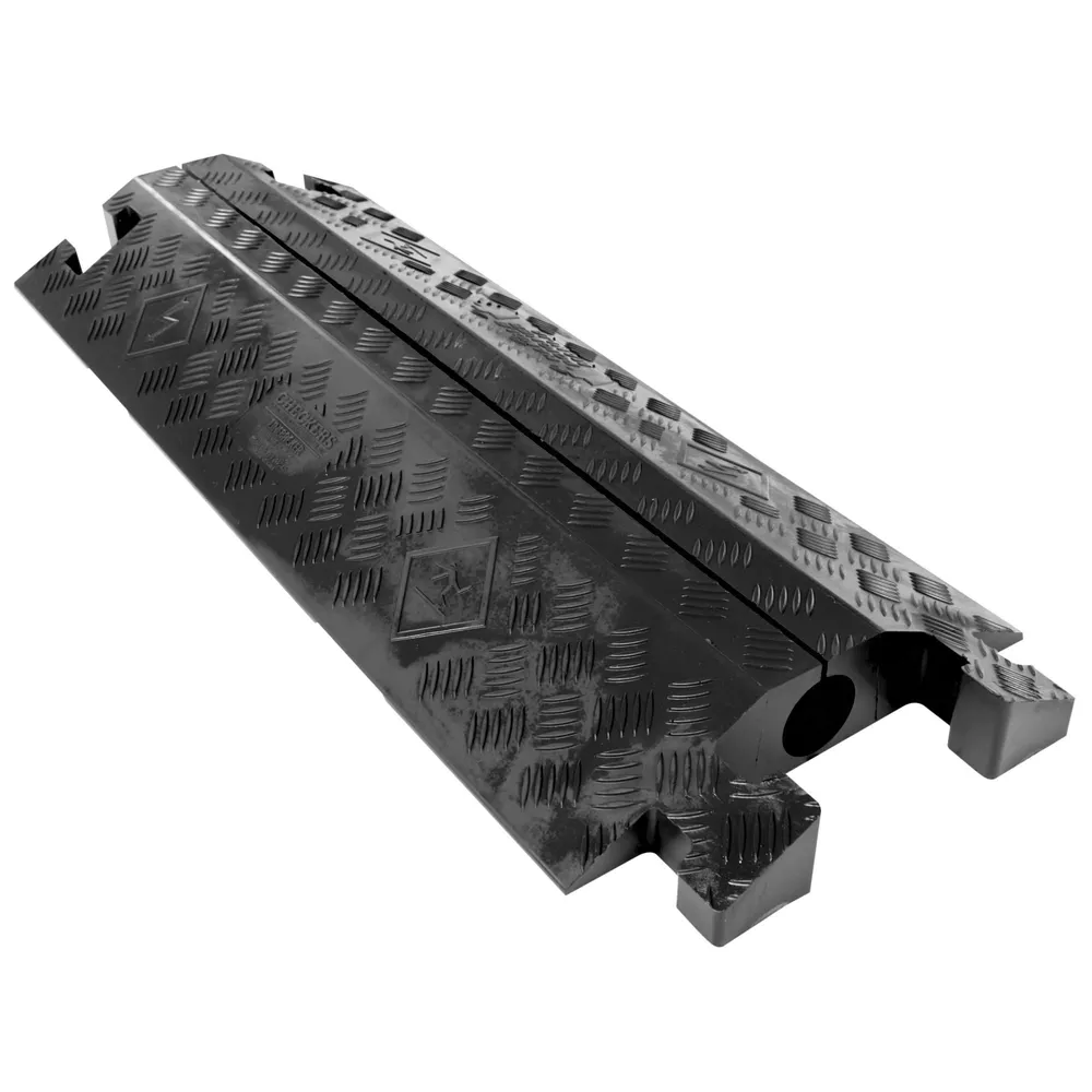 Use this single channel split-top Linebacker cable ramp to protect 2.25" diameter cables and hoses from being damaged by heavy vehicles weighing up to 17,000 lbs per axle. Patented T-connectors join multiple cable protectors to create a complete cable management system to cover long cable runs. Manufactured from durable, all-weather polyurethane, the Linebacker cable protector features a split-top design to protect your cables from the top and bottom, and make it easy to insert them into the channel. Lightweight and compact, these cable ramps are easy to transport, store, and set up.