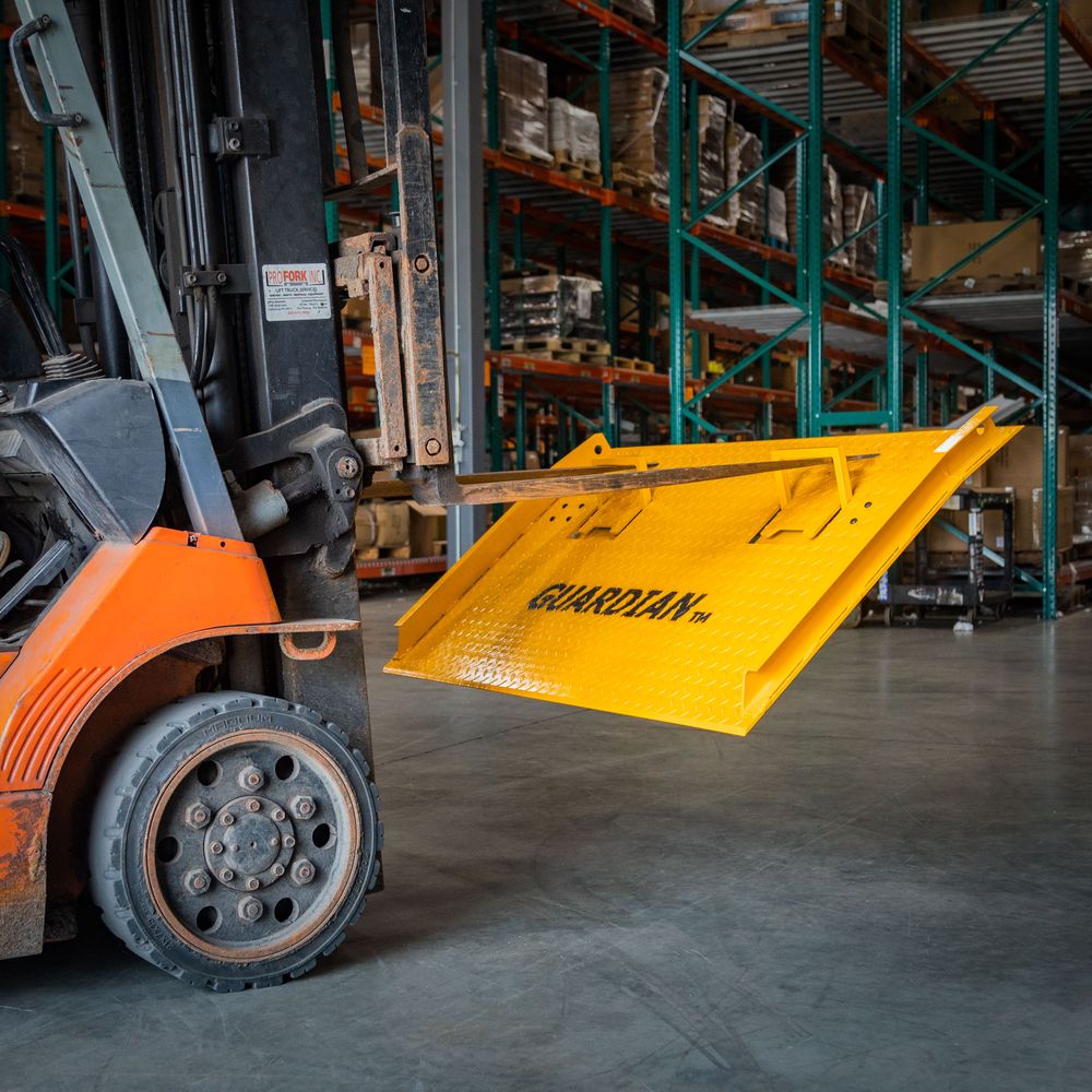 Designed to safely span the gap between loading docks, freight truck trailers, dry vans or box truck beds, the 48" x 72" Guardian Steel Dock Board supports forklift operation with a maximum weight capacity of 16,000 pounds (forklift and load combined). This size accommodates a height differential of 5" high.