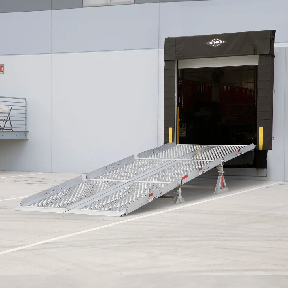 Manufactured from aluminum, it ships economically on one pallet via common carrier and is so compact, the entire system will fit in a pickup truck bed or a 4x8 trailer. The 4" high rail guards are integrated into the ramp for added safety and maximum structural support. This system accommodates docks, trailers or trucks from 15" to 48" H, with the ability to level off when the height adjustable ramp stands are set 38" to 48" H.