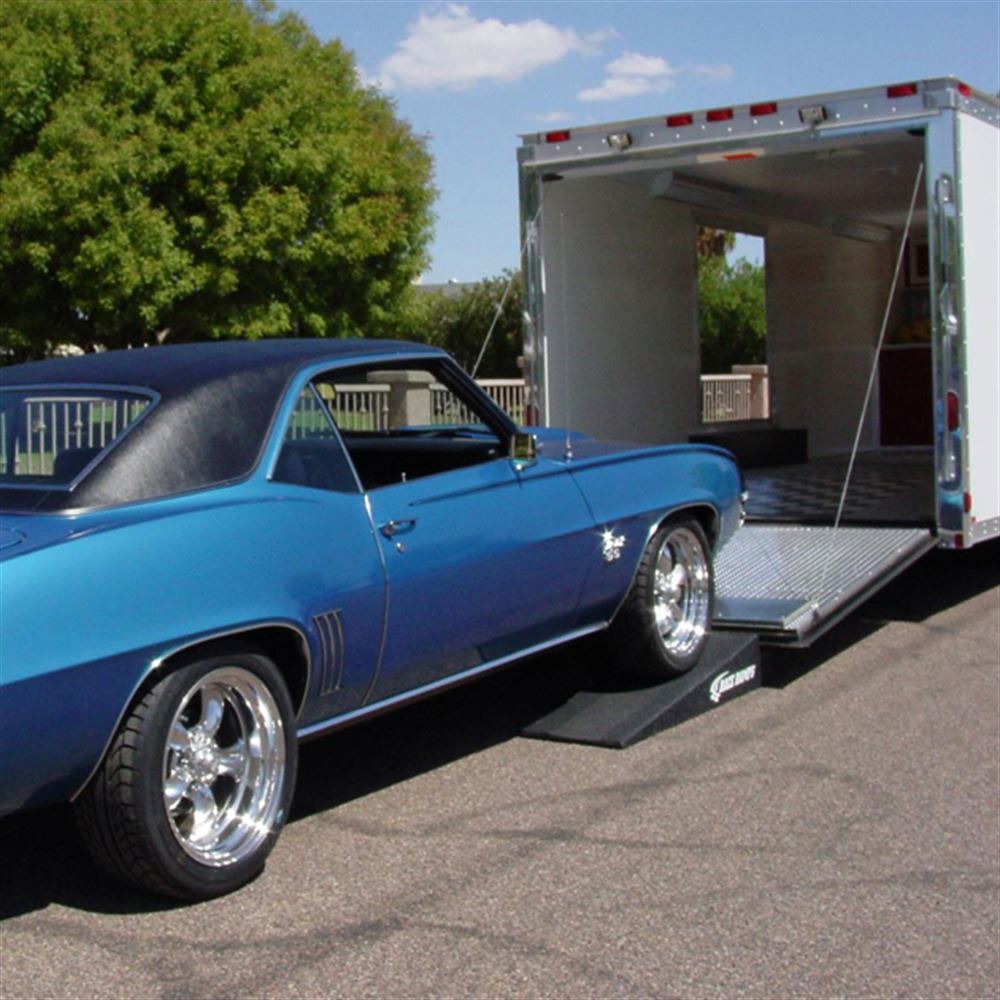 In the mood for a little racing? Load your low profile car onto a toy hauler or car trailer with the smartly designed Race Ramps™ extra long trailer ramps. Strong, yet lightweight for easy handling, these ramps have a built in notch on the edge that allows the trailer door to rest on the ramp, allowing the door to suspend 6" off the ground to gain the extra ground clearance needed. The ramps are made from a material that doesn't rust and is easy to clean. The coated no-slip surface won't scratch or scuff your garage floors or asphalt. To store, conveniently hang them with the attached handles located at the end of each ramp.