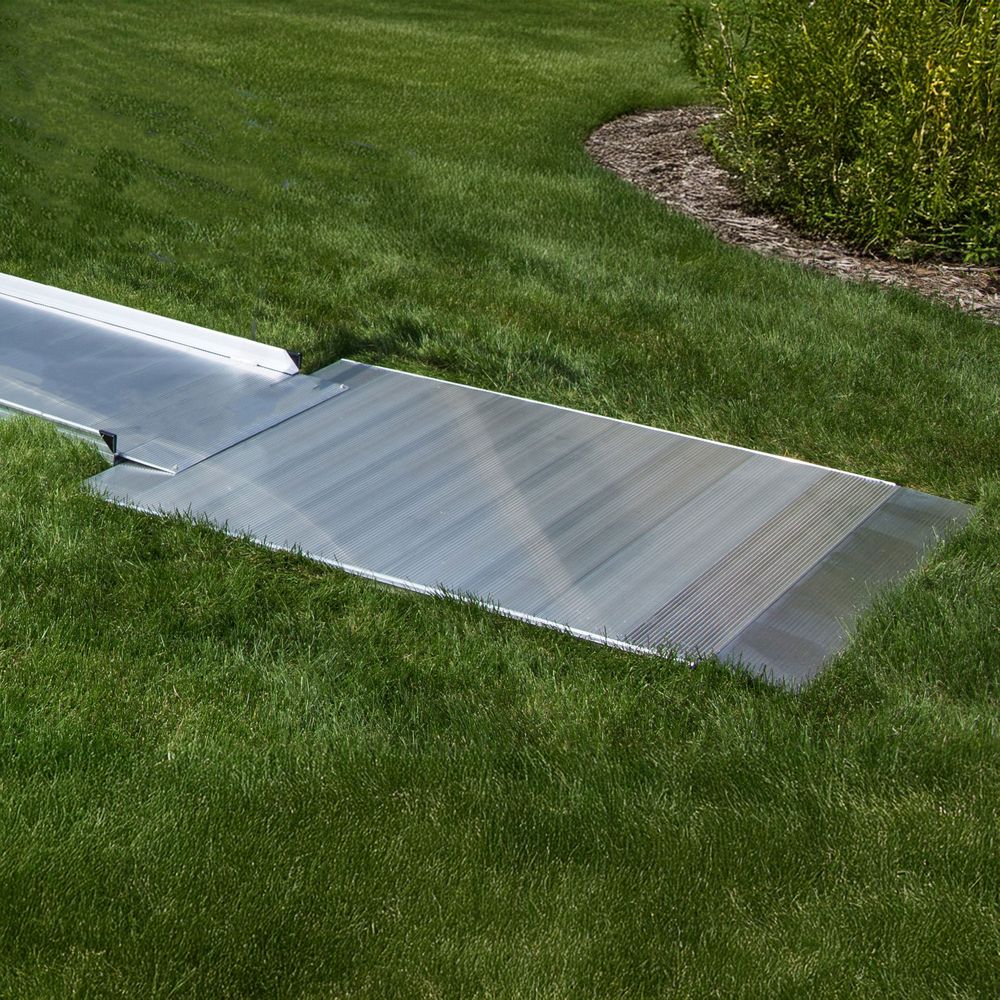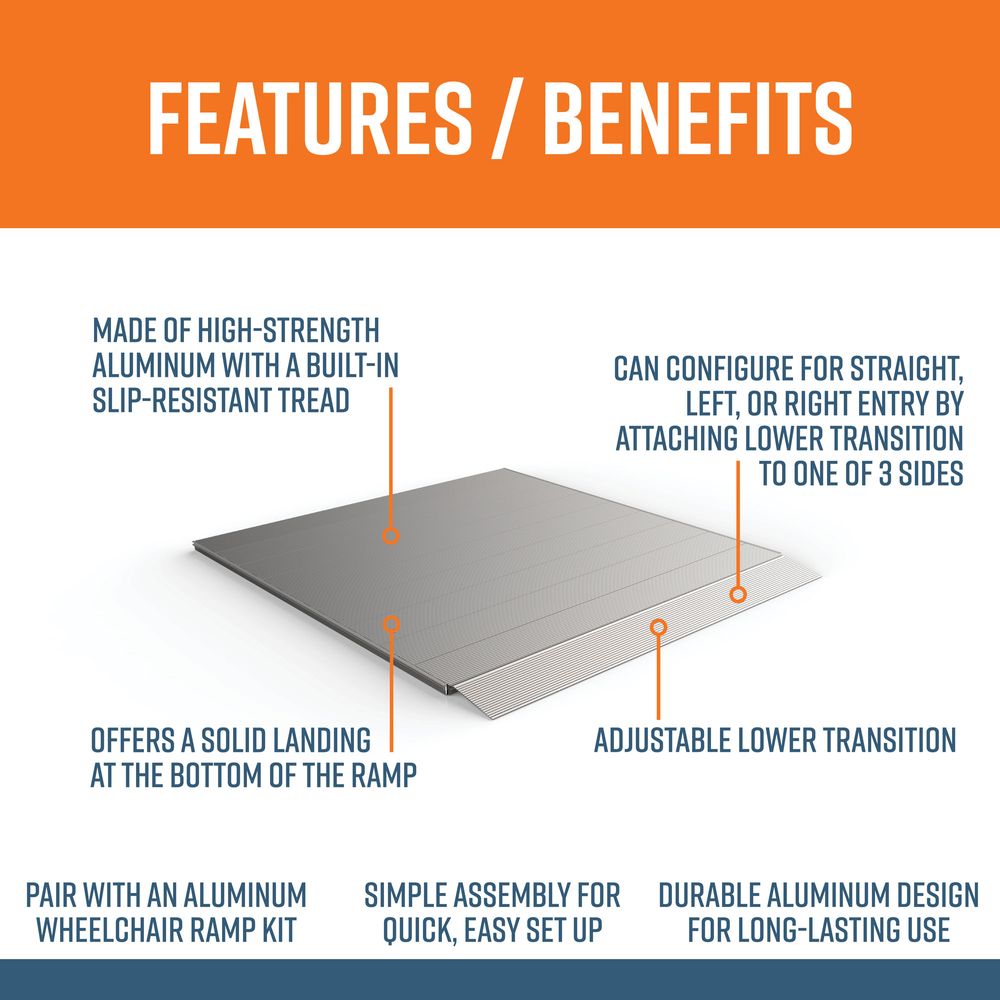 The EZ-ACCESS® PATHWAY® Solid Surface Landing Pad is used at the bottom of your PATHWAY ramp to provide a transition between the ramp and the ground. Made of high-strength, rust-proof aluminum, the maintenance-free design provides reliable access in all weather conditions. With an emphasis on safety, this landing pad can support up to 850 lbs and will last through daily exposure to the elements. The slip-resistant solid aluminum surface maintains excellent traction even in wet, muddy or snowy conditions.
