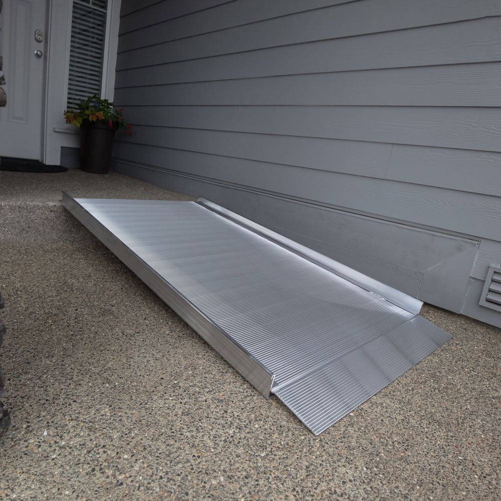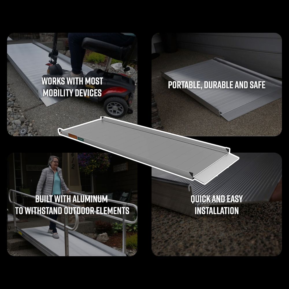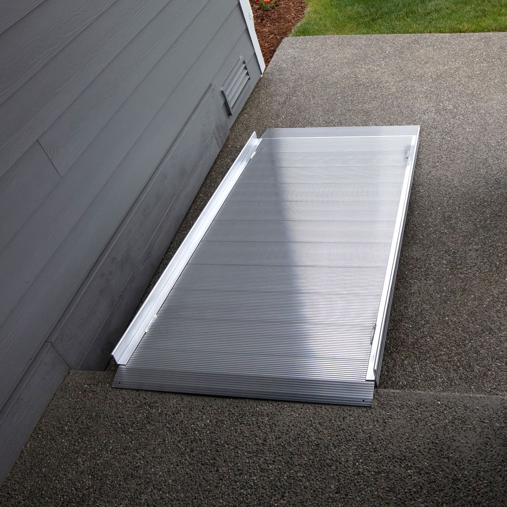 The 8 foot EZ-ACCESS ® GATEWAY 3G ramp is the perfect solution for temporary or semi-permanent home or business access where it would be impractical to install a more costly, permanent system. With an extra wide 3' non-skid platform and 3" high raised side rails, the surface is safe, secure, and stable for people in wider wheelchairs and scooters or those who use walkers, canes, or crutches. This ramp has a large 1,000 lb. weight capacity and can accommodate most scooters and powerchairs. Manufactuered in aluminum, this ramp can be used indoors or outdoors without fear of rust, and is very low-maintenance.