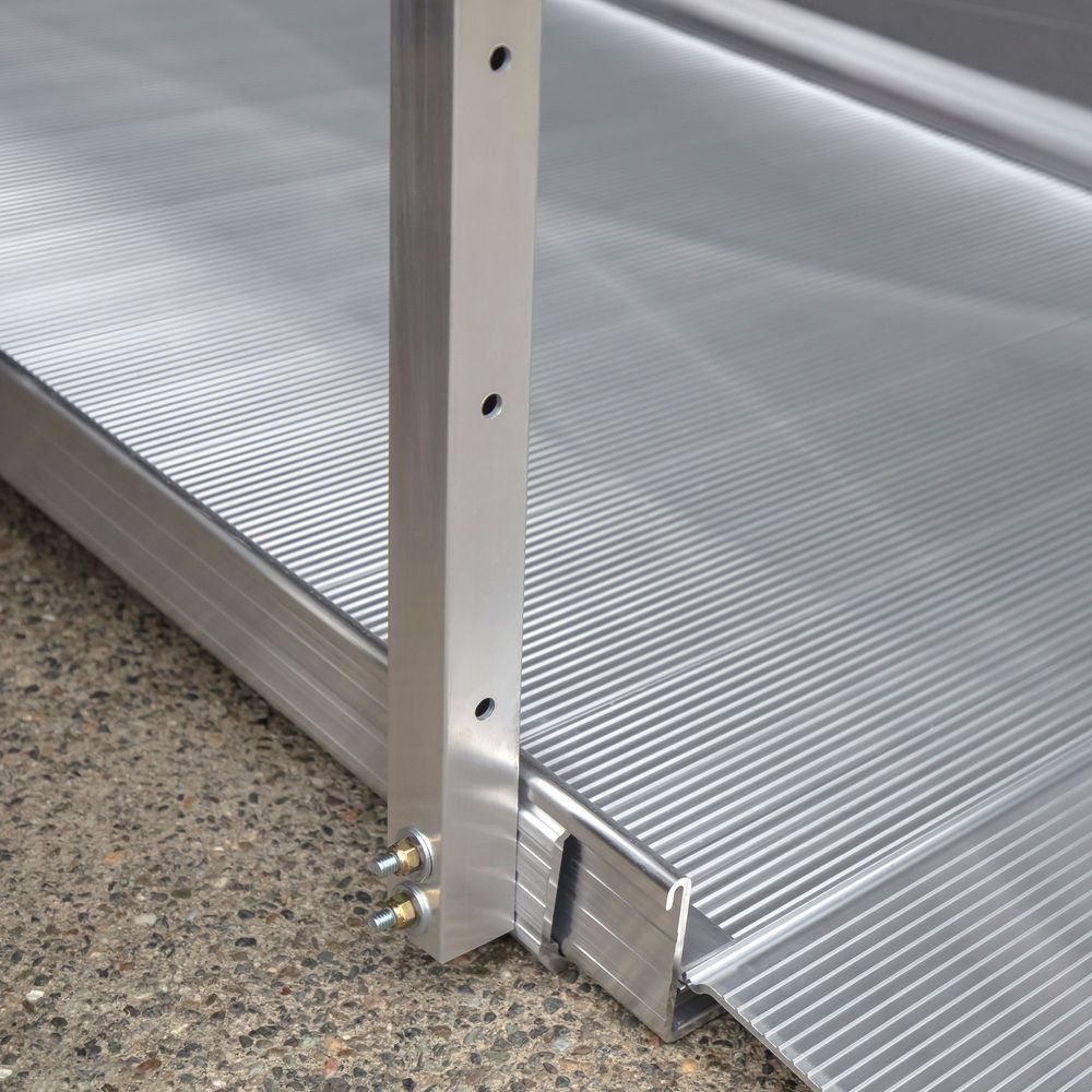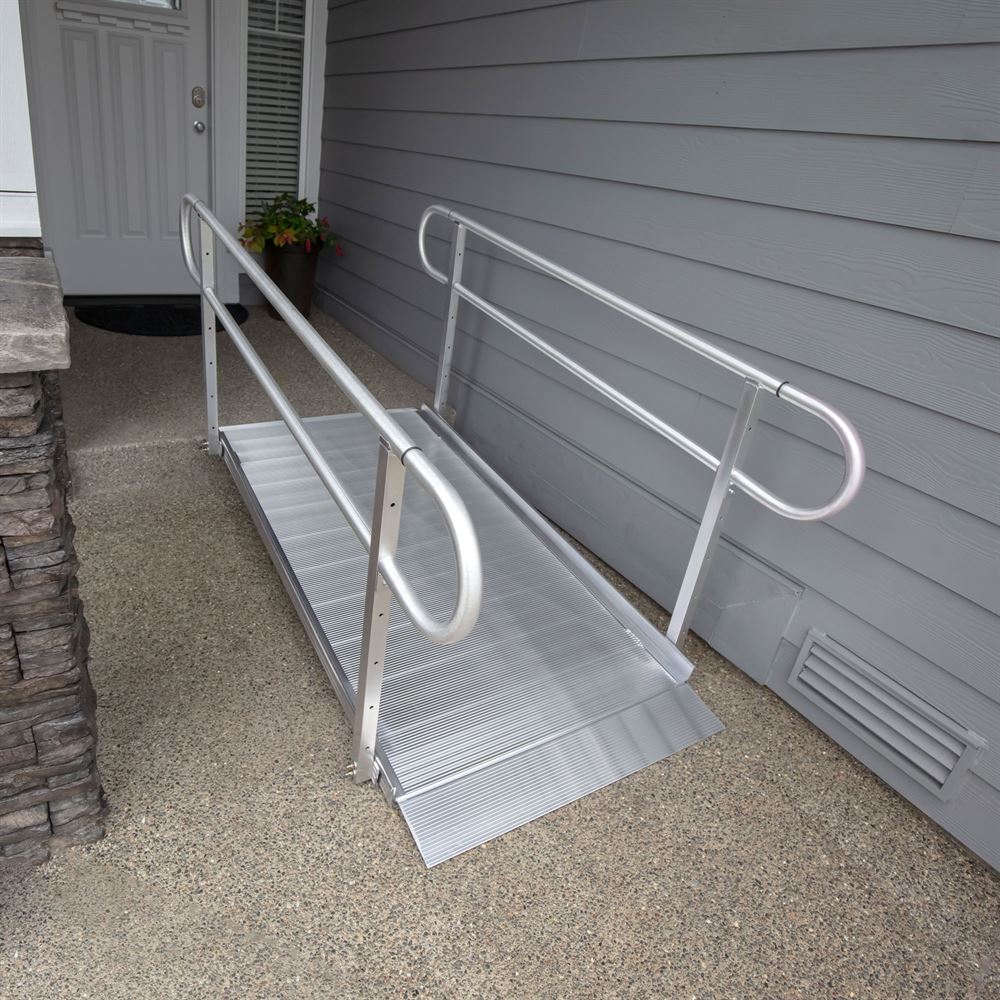 Use this 4' long aluminum EZ-ACCESS ® GATEWAY 3G ramp for temporary or permanent placement at your home or small business. This mobility ramp is more substantial than a small portable ramp, yet doesn't have the expense of permanent construction. Manufactured in aluminum, it comes with a 1,000 lb. weight capacity, and has a seamless non-skid driving surface and raised 3" side rails to accommodate mobility scooters and wheelchairs. The 3' width provides ample room for most mobility devices, and anyone using a wheelchair, scooter, walker, cane, or crutches will appreciate the stability provides by the brushed aluminum two-line handrails. This ramp system can be used inside or outdoors, and it will never rust.