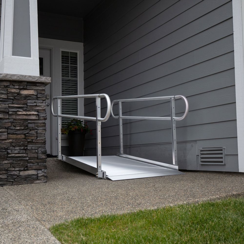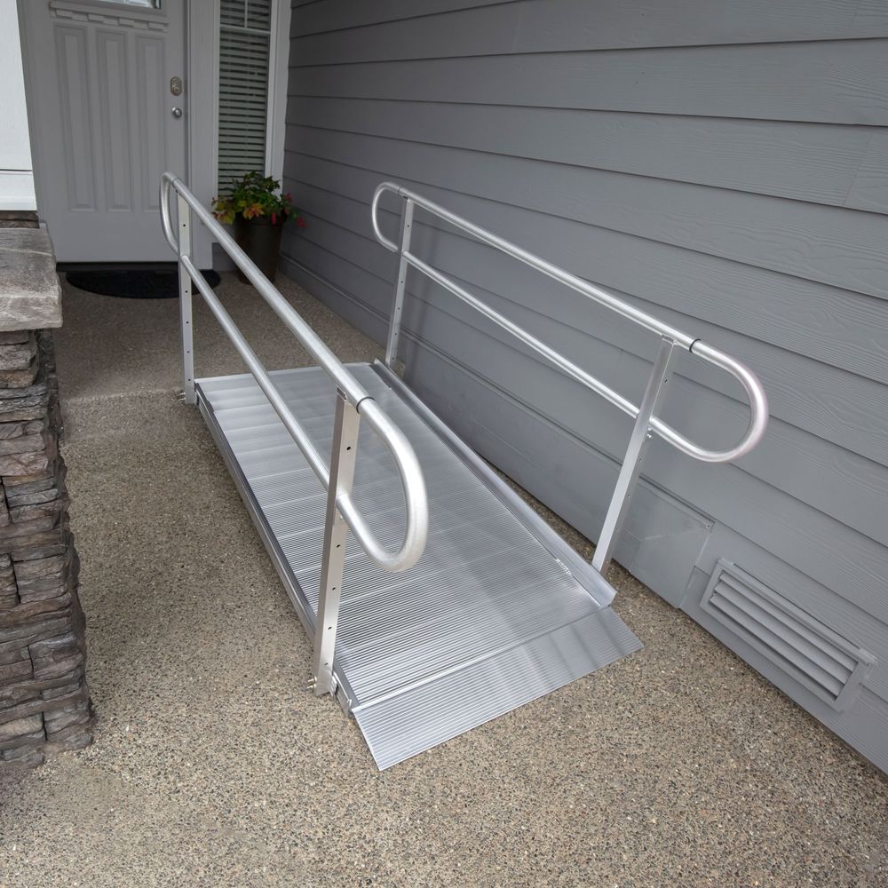 Use this 9' long aluminum EZ-ACCESS ® GATEWAY 3G ramp for temporary or permanent placement at your home or small business. This mobility ramp is more substantial than a small portable ramp, yet doesn't have the expense of permanent construction. Manufactured in aluminum, it comes with a 1,000 lb. weight capacity, and has a seamless non-skid driving surface and raised 3" side rails to accommodate mobility scooters and wheelchairs. The 3' width provides ample room for most mobility devices, and anyone using a wheelchair, scooter, walker, cane, or crutches will appreciate the stability provides by the brushed aluminum two-line handrails. This ramp system can be used inside or outdoors, and it will never rust.