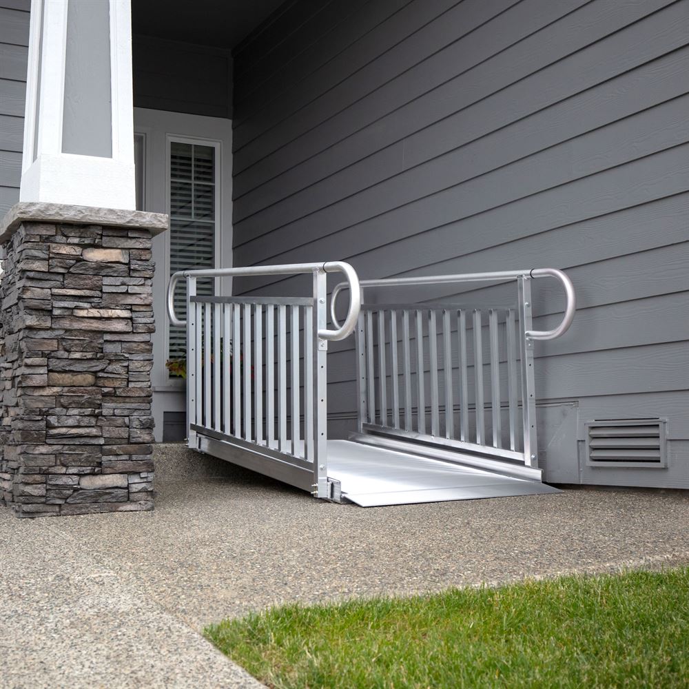 Use this 4' long aluminum EZ-ACCESS ® GATEWAY 3G ramp for temporary or permanent placement at your home or small business. This mobility ramp is more substantial than a small portable ramp, yet doesn't have the expense of permanent construction. Manufactured in aluminum, it comes with a 1,000 lb. weight capacity, and has a seamless non-skid driving surface and raised 3" side rails to accommodate mobility scooters and wheelchairs. The 3' width provides ample room for most mobility devices, and anyone using a wheelchair, scooter, walker, cane, or crutches will appreciate the stability provides by the brushed aluminum vertical picket handrails. This ramp system can be used inside or outdoors, and it will never rust.