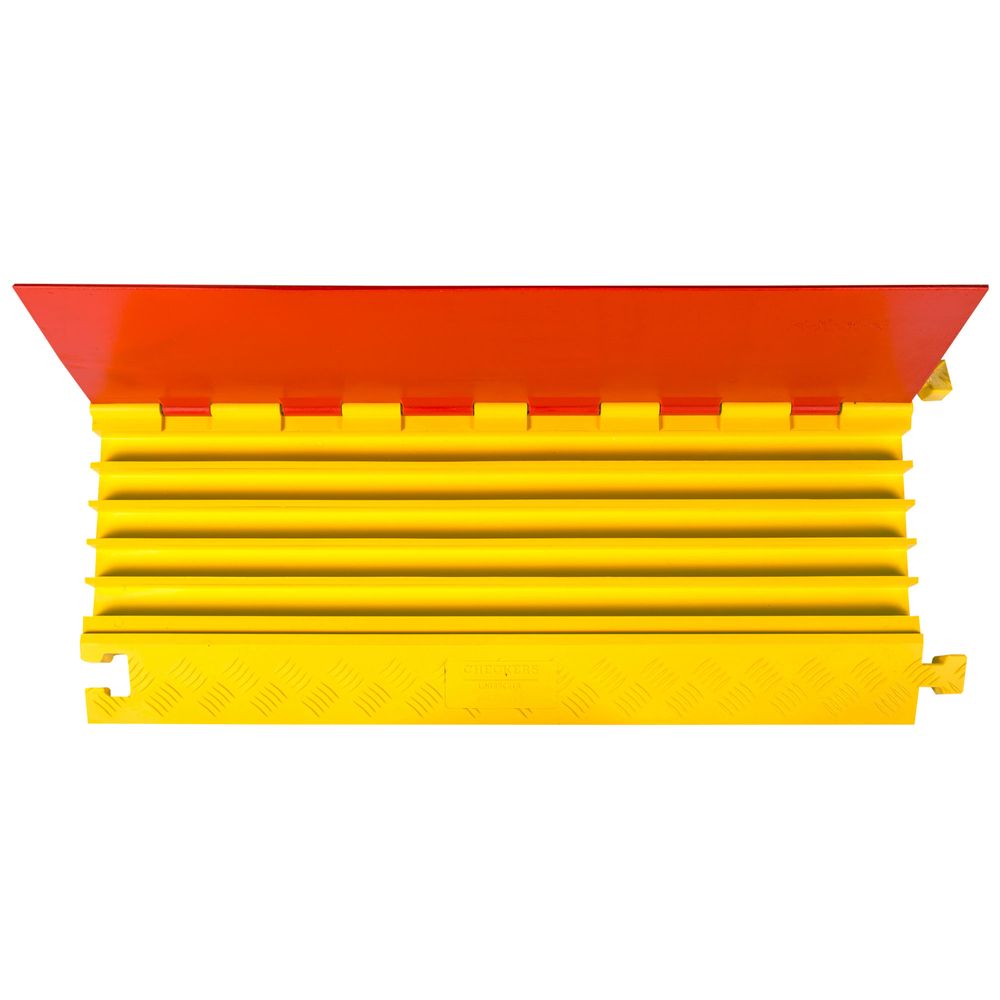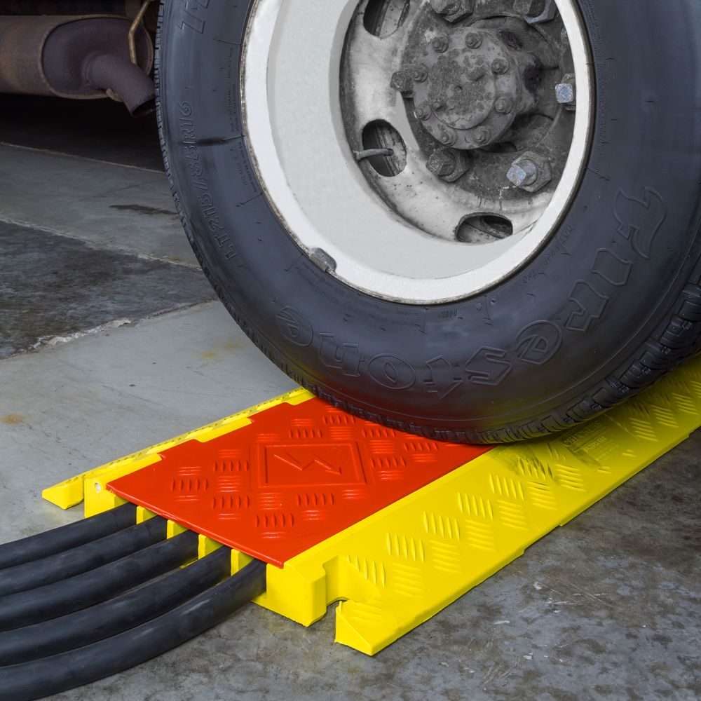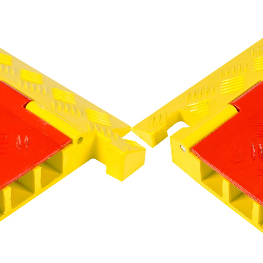General Purpose Linebacker Cable Ramps are perfect for use in public, commercial, and industrial areas where exposed cables need to be protected. The surface of the cable ramps have a patented five-bar tread pattern for maximum traction, while the hinged lid on the surface allows for easy placement and removal of cables and prevents human contact with the cables. Underneath the cable ramp section there is a carrying handle for maximum transportability and easy setup. Each end of the ramp has a male and female T- connector to interlock modular sections. The ramps are manufactured from all-weather polyurethane for worry-free use outdoors. Custom company logos can be molded into the ramp lids (call for details). No tools are required for setup or assembly.