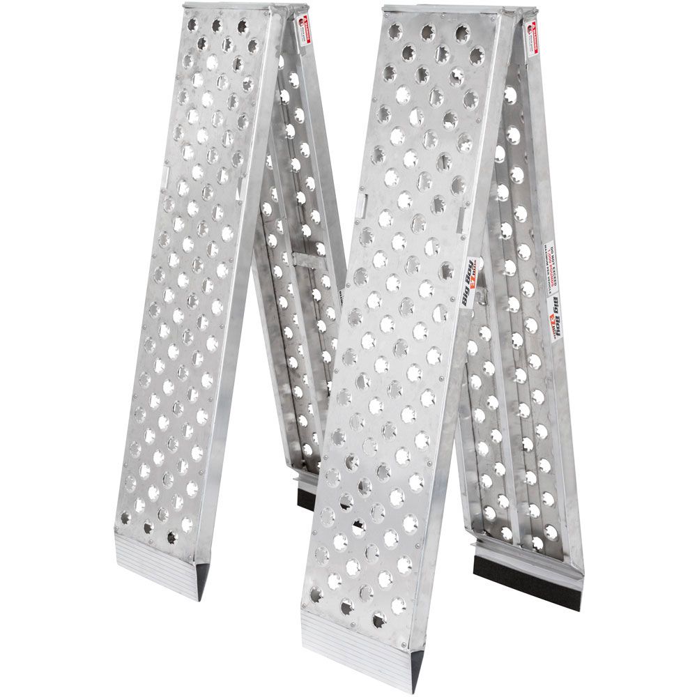 This convenient ramp system can help load almost every toy you own. Use it when transporting all of your equipment, including 4-wheelers, golf carts, lawn mowers, and motorcycles. Simply slide the ramps next to one another to create a 28" wide single runner ramp - perfect for loading larger bikes. Then pop the provided quick-connect C brackets through the fabricated slots and clip the attached pins into place to securely reconfigure and repurpose this handy ramp system. When you're finished loading your golf cart or UTV onto your truck or trailer, the aluminum ramps stow conveniently underneath your 4-wheeler, thanks to their portable folding design.