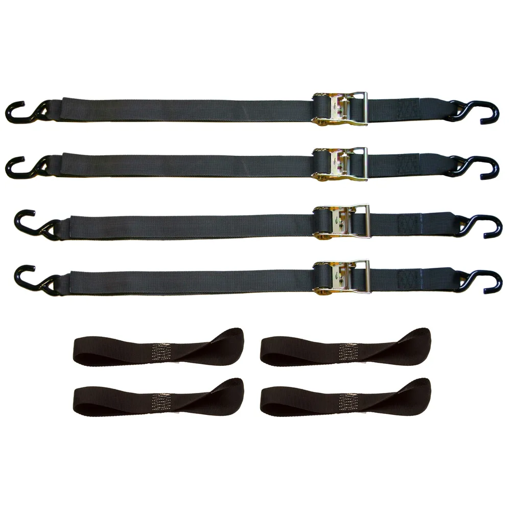 - Kit includes 4 ratchet straps with coated S-hooks and 4 soft loops