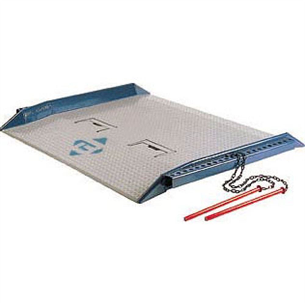 This heavy duty steel dock board features two red pins and full length side side pockets on each side for maximum versatility. When properly positioned in one of the side pocket holes, these pins hold the dock board firmly in place guarding against slippage. These pins provide safe loading conditions for container and park-out applications. Raised sides painted blue help the user to prevent run-off. Featured on the surface of the dock boards are two self storing fork lift pockets for easy and quick maneuverability and placement on a dock. Increase product life, safety, and work efficiency with these heavy duty dock boards. When choosing a heavy duty dock board please allow and extra 12 to 18" more width then the widest load that will accommodate the dock board. This will ensure maximum clearance and maneuverability.