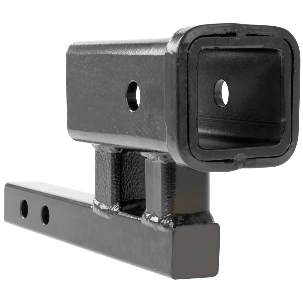 The Elevate Outdoor Hitch Adapter converts a 1-1/4" hitch receiver tube to 2", eliminating dangerous mismatched trailer hitch configurations. Each hitch adapter is 12" long with a 6-1/8" overlay extension for use in either rise or drop applications, with 6-1/4" and 7-7/8" length between pin holes.