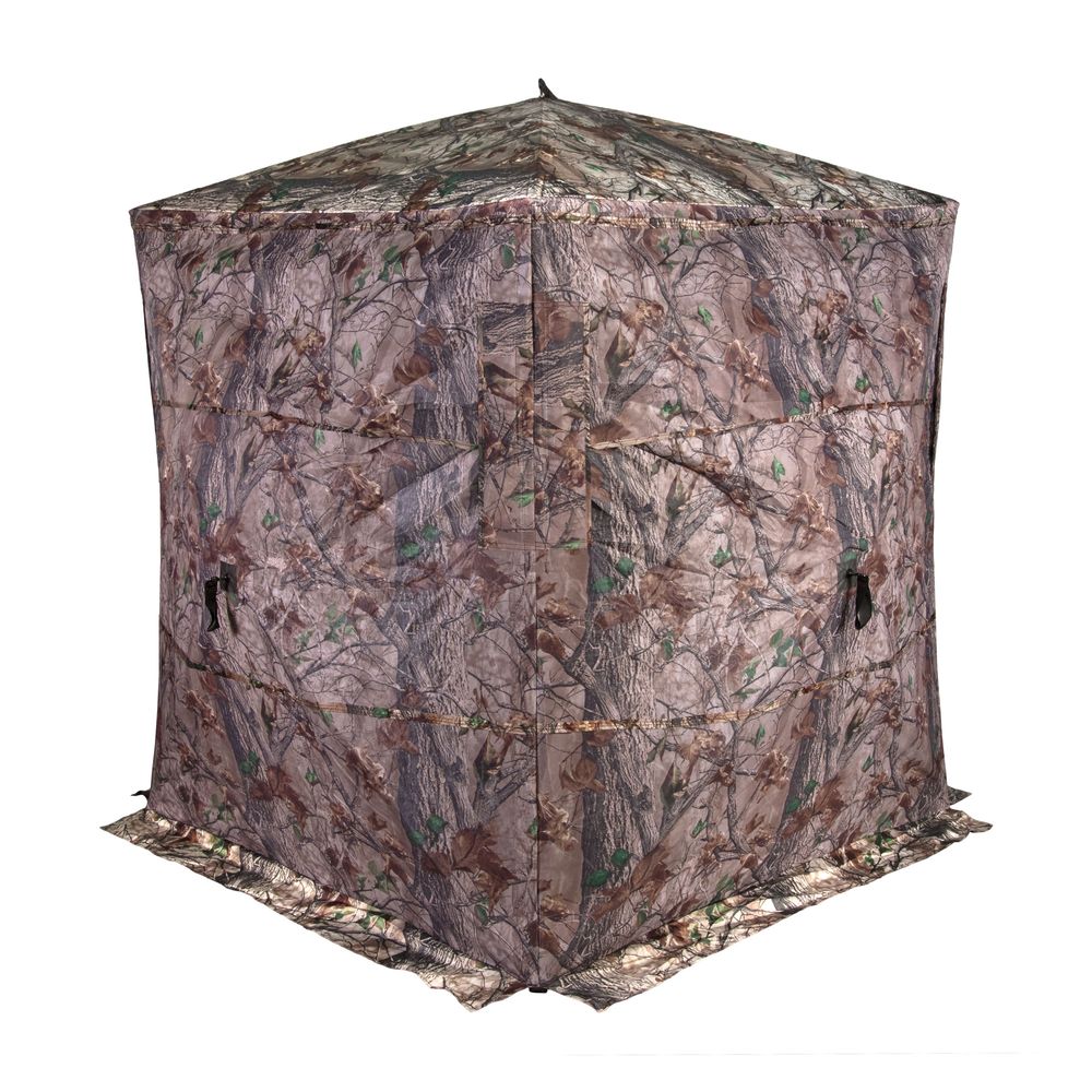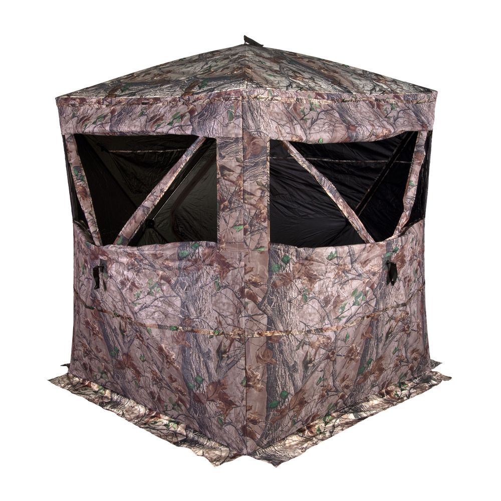 Thanks to its two full-sized panoramic windows with see-through mesh, silent slider adjustments, and oversized 53" L x 53" W footprint, the Prevue 2-Person Blind delivers superb concealment and plenty of space for you and a buddy. The Prevue's stealthy design allows you to see out without your prey seeing in. Black-backed, water-resistant camouflaged fabric construction.