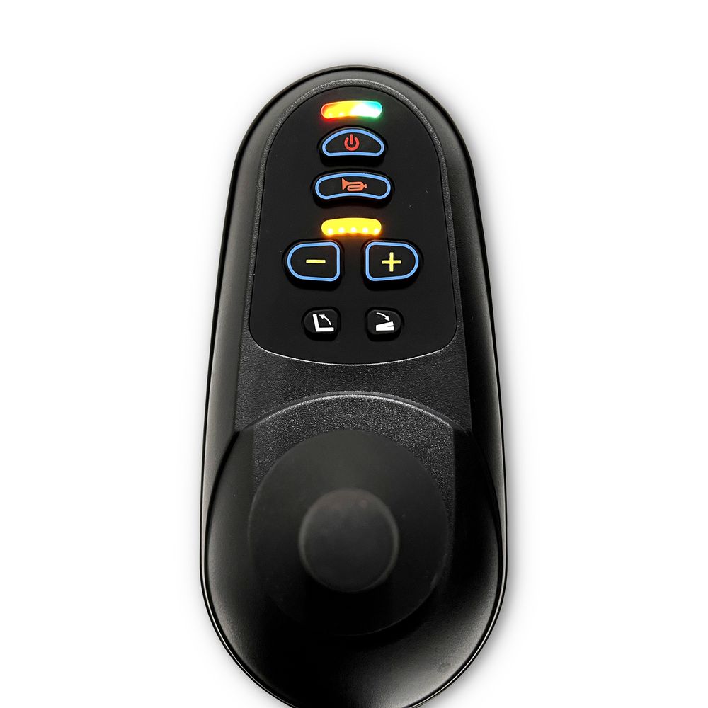 It's equipped with a waterproof, intelligent joystick for easy seated control while in the chair, as well as a remote that allows a caregiver to control the chair without needing to push. The joystick mounts to the left or right armrest and features power on/off button with a power indicator light, speed selection and folding/unfolding buttons, as well as a horn. The 20AH lithium-ion battery powers two 250W brushless DC motors that deliver a range of up to 17 miles.