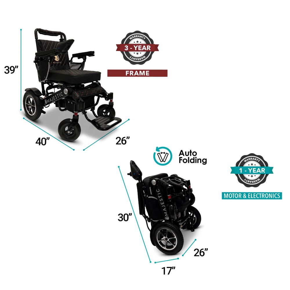 ComfyGo's Majestic 20AH Remote-Controlled Electric Wheelchair with Auto-Fold is a beautifully designed, lightweight travel solution. This motorized transport wheelchair is cruise- and airline-approved, and features a weight capacity of 350 lbs.