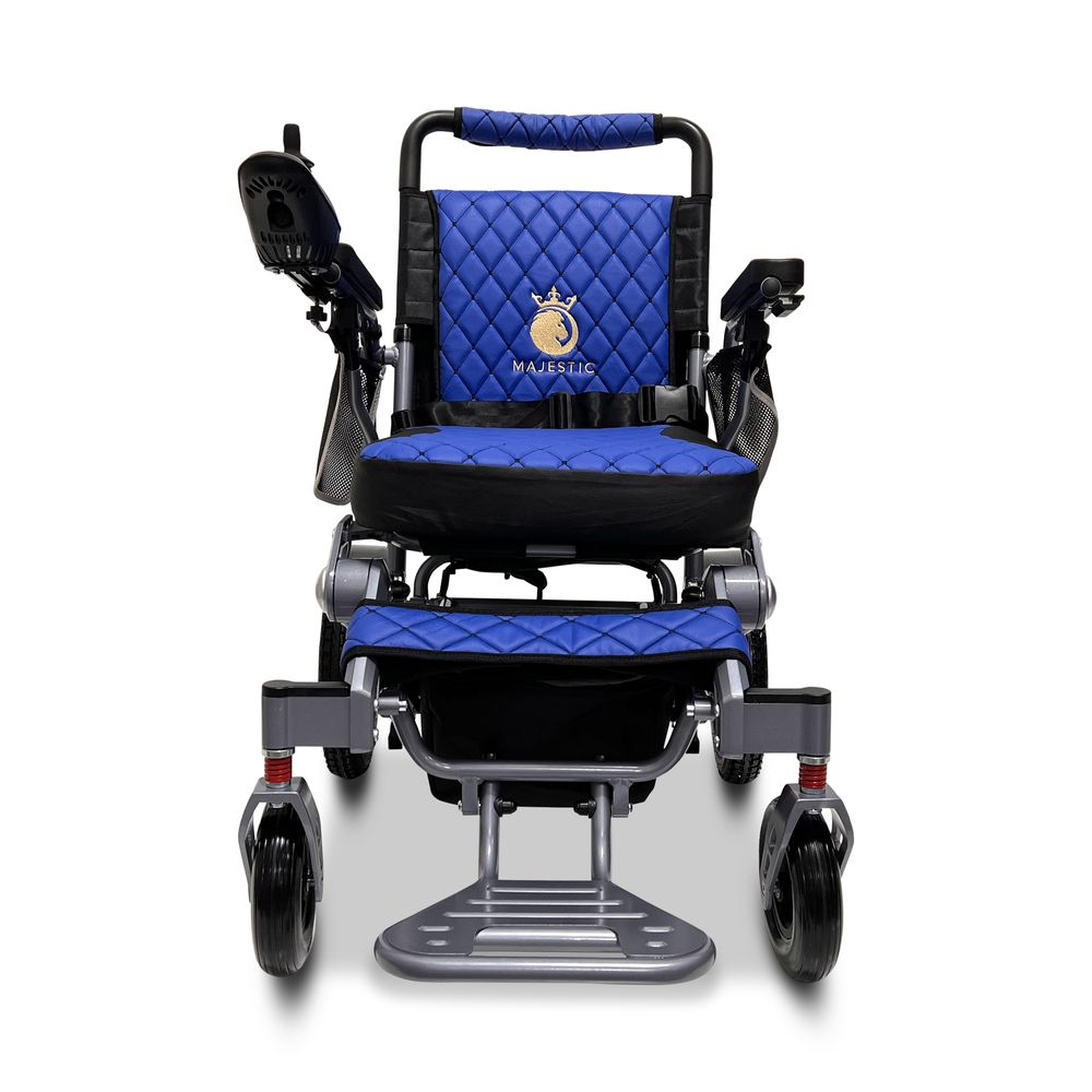 ComfyGo Majestic 12AH Remote-Controlled Electric Wheelchair - Silver Frame/Blue Faux Leather
