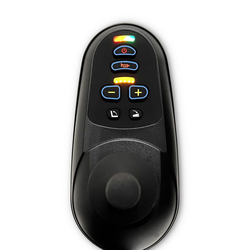 It's equipped with a waterproof, intelligent joystick for easy seated control while in the chair, as well as a remote that allows a caregiver to control the chair without needing to push. The joystick mounts to the left or right armrest and features power on/off button with a power indicator light, speed selection buttons, and a horn. The 12AH lithium-ion battery powers two 250W brushless DC motors that deliver a range of up to 13 miles.