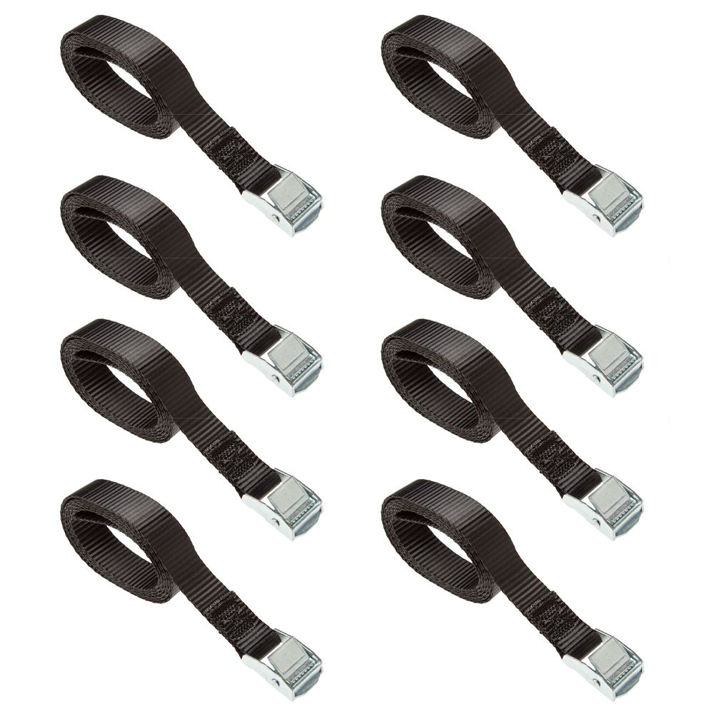 These 1" wide straps have countless everyday uses, including tying down items being moved, securing containers, staking trees, locking coolers while camping, hanging items in your garage, and more. The solid steel clamp has a spring hinge and teeth for added grip, preventing the strap from slipping. Each strap is 60" long with a 220 lb. break limit and a 100 lb. usage limit making them perfect for holding down cargo roof boxes and bags. String multiple straps together for added length.