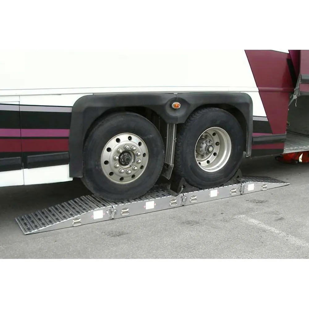 The Portable Aluminum Bus Service Stands are perfect for general maintenance or major servicing of commercial and school buses or any other large commercial vehicles. Load tested at 112,700 lbs each (80,000-lb design), these bus stands will accommodate just about any commercial medium- or heavy-duty vehicles for service. The bus ramps feature integrated carrying handles and break down into portable sections, each of which weigh no more than 50 lbs, making them easy to transport. The stands feature a commercial-grade belted rubber to prevent sliding during loading. Professionally tested by engineers and used by the Ontario DOT, these are the highest-quality commercial bus stands on the market.