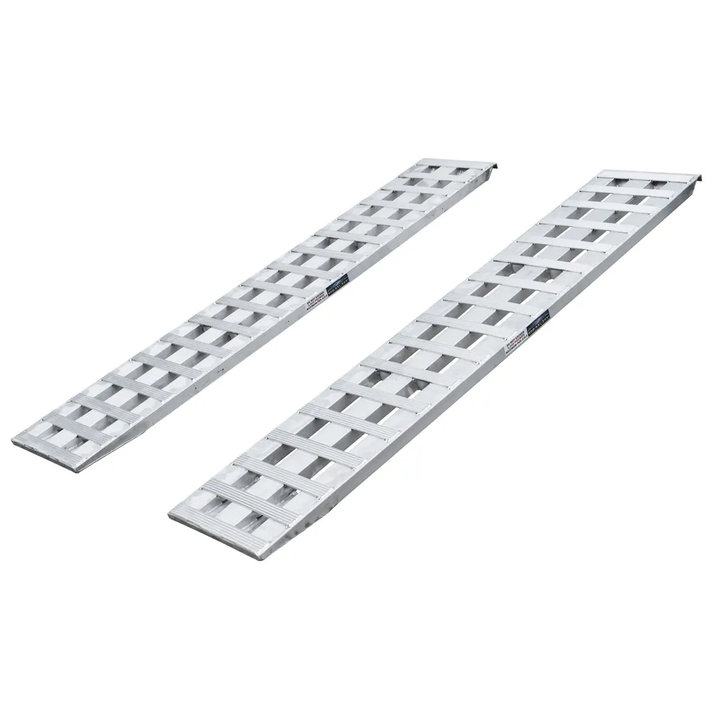 Easily load and haul cars, trucks, and other equipment onto trailers with these tough, lightweight truck trailer ramps. Manufactured from high-strength, lightweight aluminum, these ramps feature a 5,000 lb. per axle weight capacity and are light enough to be lifted and maneuvered by one person. Available with a stub foot for increased versatility in loading heights, these trailer ramps have a serrated rung surface for additional strength and traction in wet or muddy conditions. Their hook-end design will hook over existing rub or round rails up to 1-5/16" in diameter to prevent the ramps from kicking out while in use. For the safest loading experience, our low-profile trailer ramps are specifically designed for low-clearance vehicles to reduce the incline and prevent bottoming out.