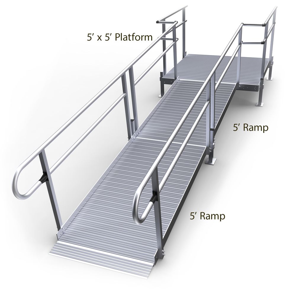 - Includes one 5' x 5' top platform, two 5' ramps, accompanying handrails