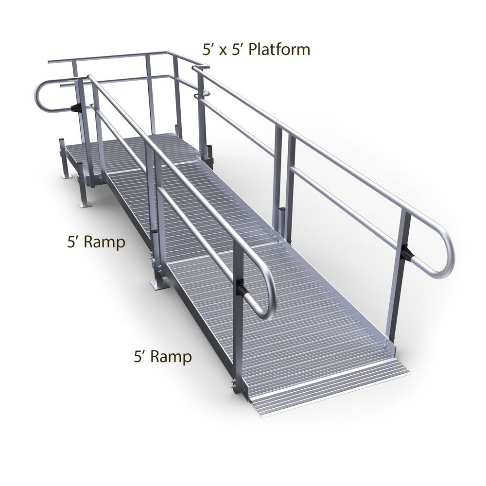 - Includes one 5' x 5' top platform, two 5' ramps, accompanying handrails