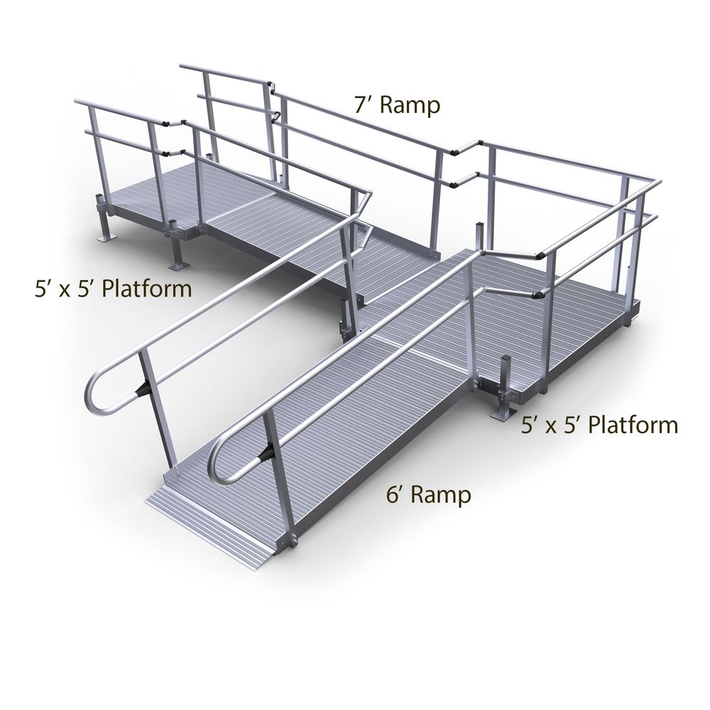 - Includes one 5' x 5' top platform, 7' middle ramp, one 5' x 5' turning platform, one 6' bottom ramp, accompanying handrails