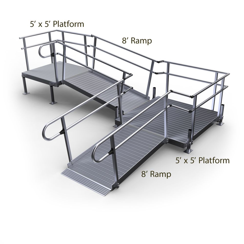 - Includes one 5' x 5' top platform, 8' middle ramp, one 5' x 5' turning platform, one 8' bottom ramp, accompanying handrails