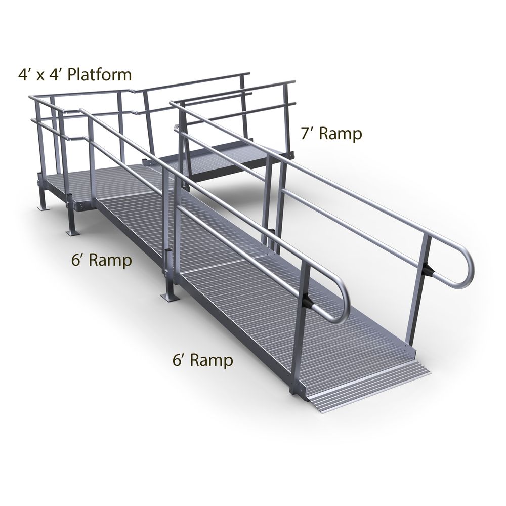 - Includes one 7' entry ramp, one 4' x 4' turning platform, two 6' ramps, accompanying handrails