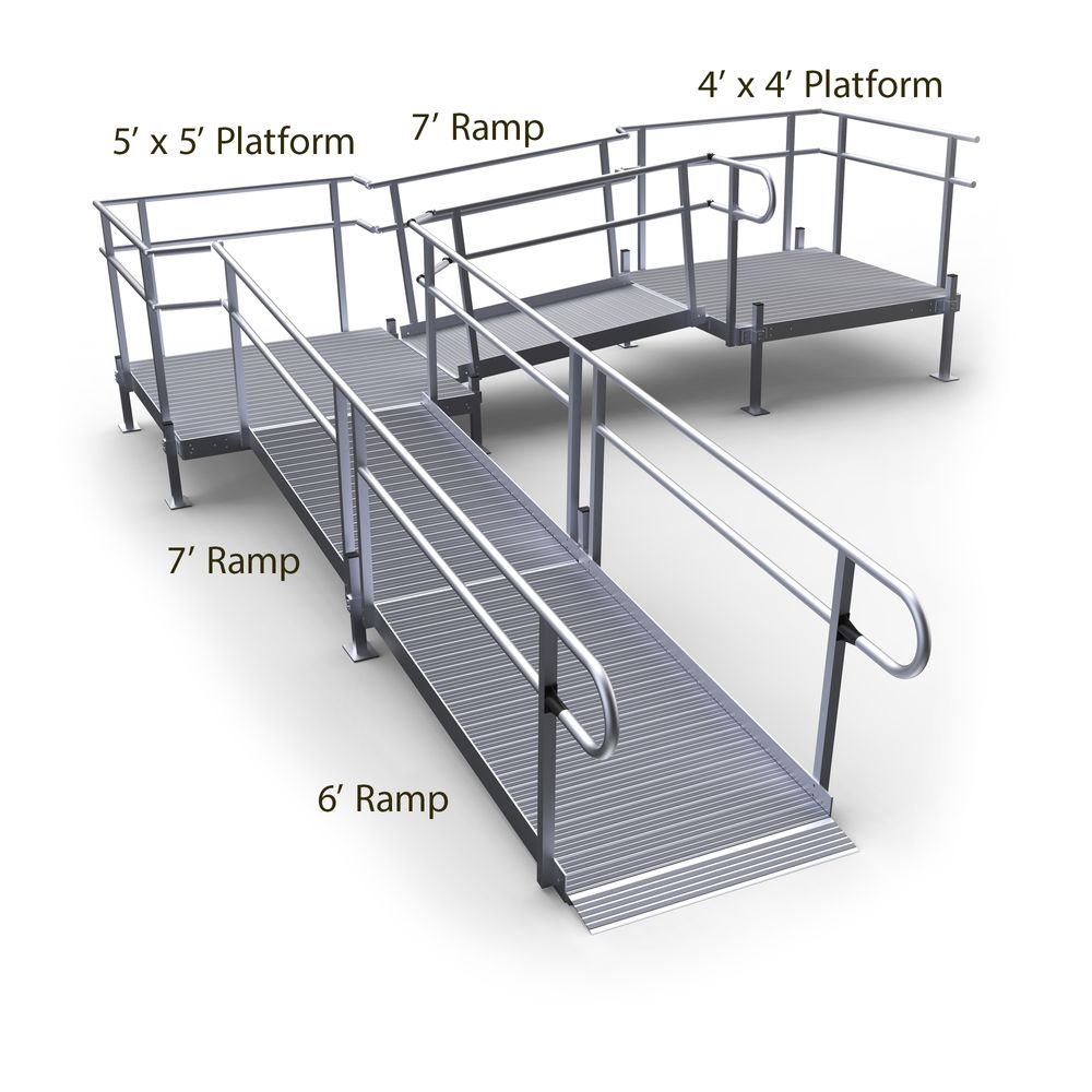 - Includes one 4' x 4' top platform, 7' middle ramp, one 5' x 5' turning platform, one 7' ramp, one 6' ramp, accompanying handrails