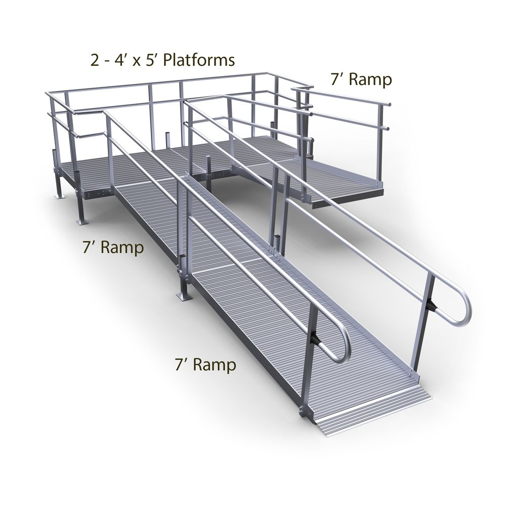 - Includes 7' entry ramp, two 4' x 5' turning platforms, two lower 7' ramps, accompanying handrails