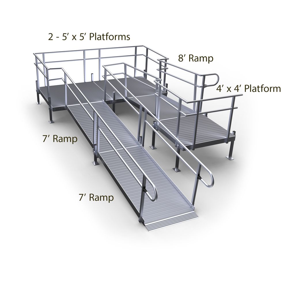 - Includes top 4' x 4' platform, one 8' ramp, two 5' x 5' turning platforms, two lower 7' ramps, with accompanying handrails