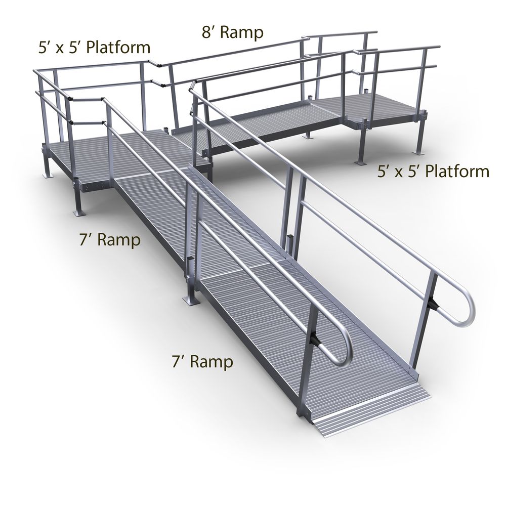 - Includes one 5' x 5' top platform, 8' middle ramp, one 5' x 5' turning platform, two 7' ramps, accompanying handrails