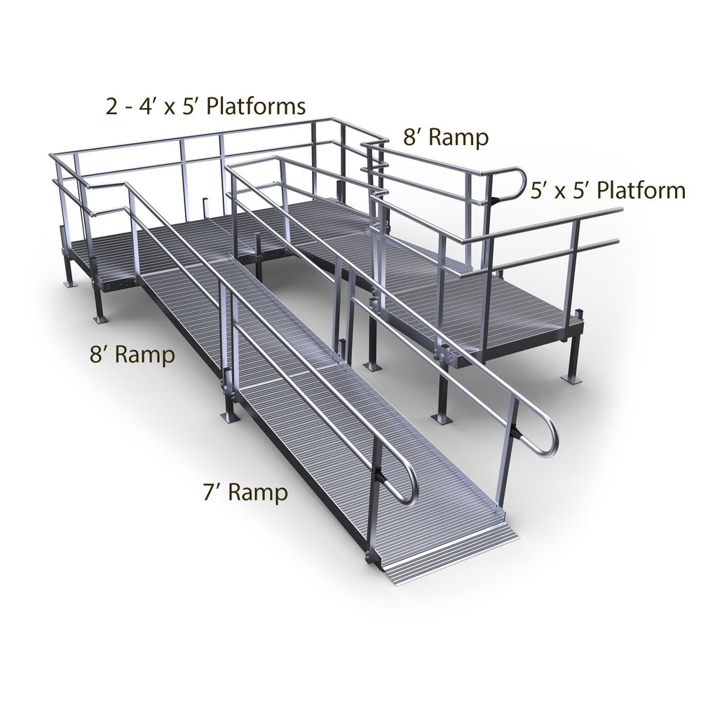 - Includes top 5' x 5' platform, one 8' ramp, two 4' x 5' turning platforms, one 8' ramp, one 7' ramp, with accompanying handrails