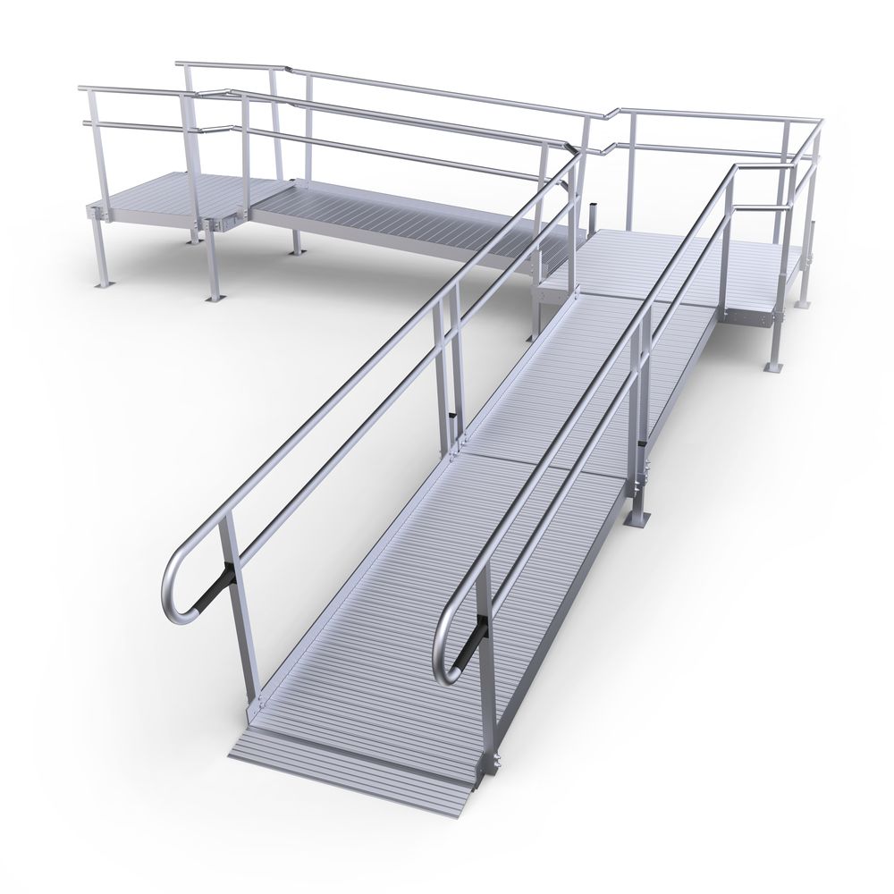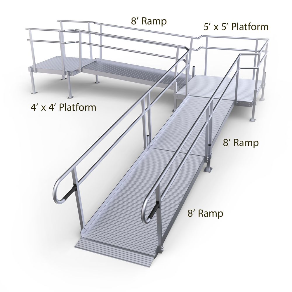 - Includes one 4' x 4' top platform, 8' middle ramp, one 5' x 5' turning platform, two 8' ramps, accompanying handrails
