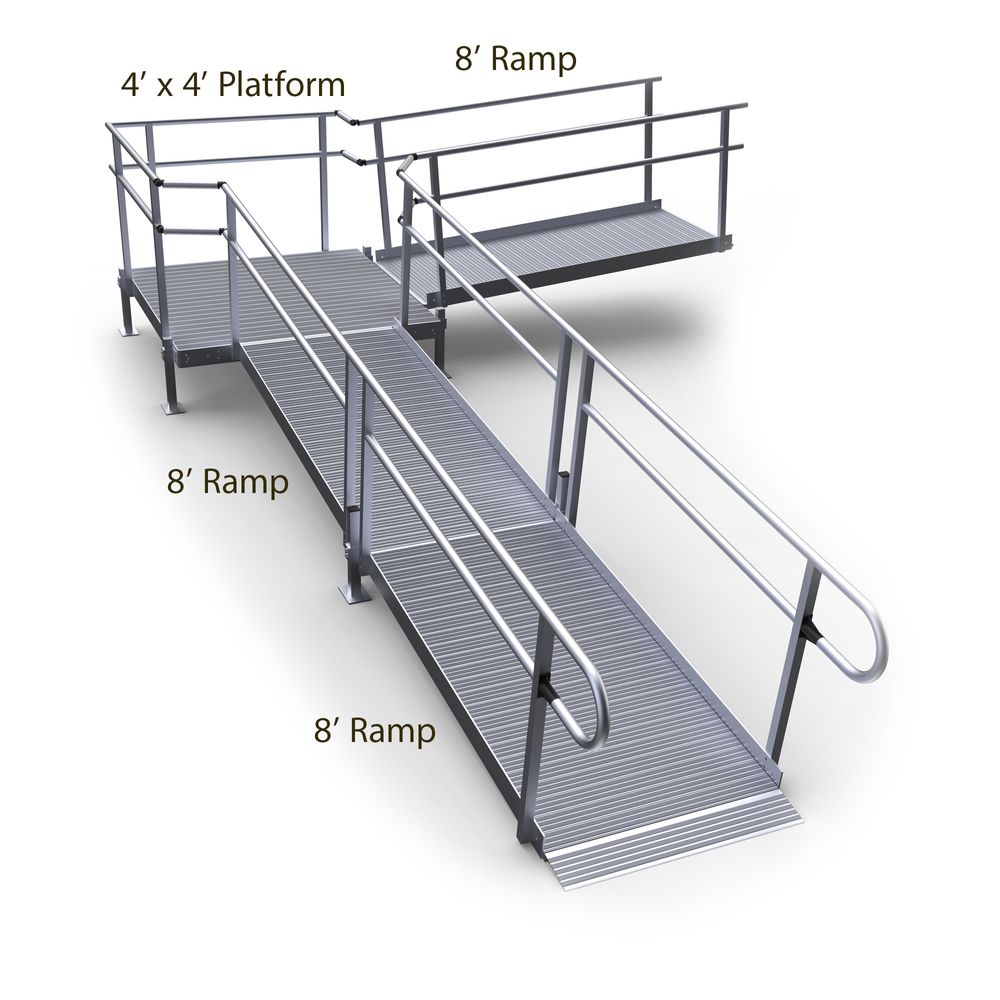 - Includes one 8' entry ramp, one 4' x 4' turning platform, two 8' ramps, accompanying handrails