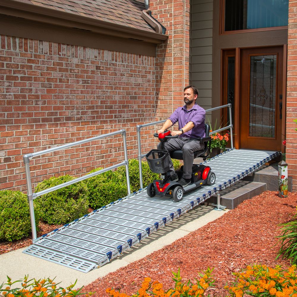 Each kit includes all of the necessary components to install your chosen ramp configuration: Ramp sections for 30' length, support stands, handrails for one side of the ramp, approach plates, and quick-connect pins. It supports up to 1,000 pounds and accommodates all wheelchairs, power chairs, three-wheel and four-wheel mobility scooters.