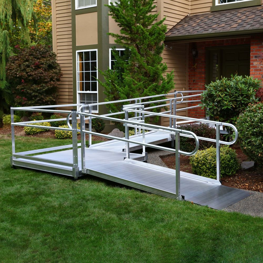 This 12' L L-Shaped Wheelchair Ramp Kit With 5' Turn Platform includes two 6' ramps, one 5' x 5' turn platform, handrails, and all other necessary components.