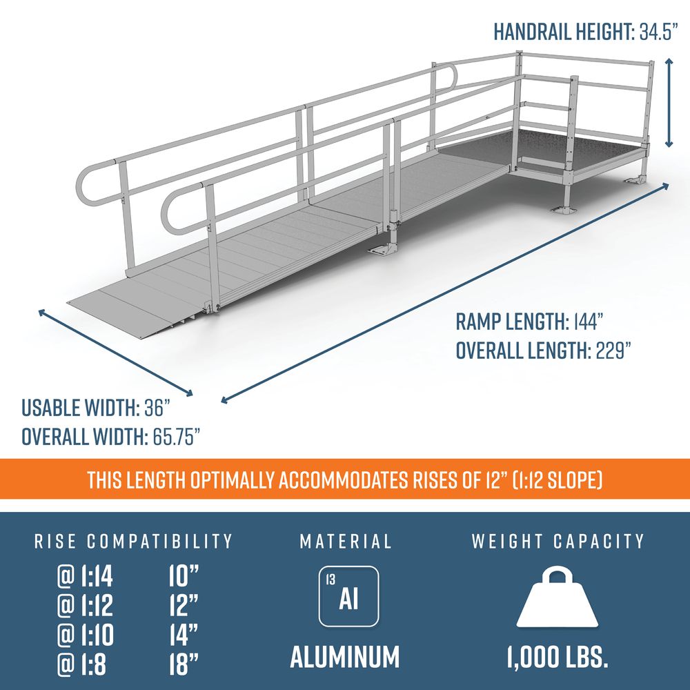 Durable, dependable, and American made, the modular design installs easily with minimal tools, meaning you can have a solution that's ready to be used the day that it arrives. Constructed from high-strength aluminum with an extruded tread for all-weather traction, the ramp kit features multi-positional base feet with independently-adjustable legs so that setting the slope and leveling the ramp is as easy as possible. A lower plate ensure smooth ramp-to-ground transitions for mobility devices, and both the 2" curbs and two-tier handrails provide additional safety and security whether wheeling or walking.