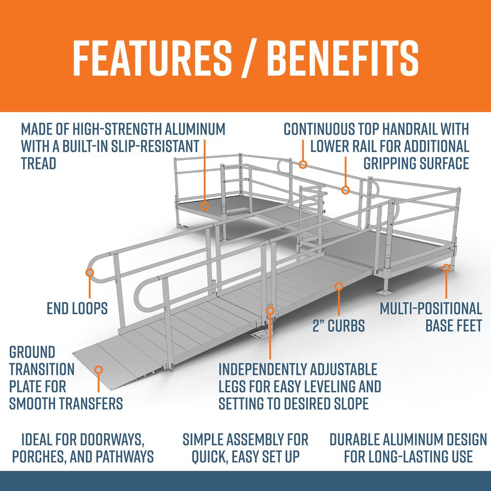 Durable, dependable, and American made, the modular design installs easily with minimal tools, meaning you can have a solution that's ready to be used the day that it arrives. Constructed from high-strength aluminum with an extruded tread for all-weather traction, the ramp kit features multi-positional base feet with independently-adjustable legs so that setting the slope and leveling the ramp is as easy as possible. A lower plate ensure smooth ramp-to-ground transitions for mobility devices, and both the 2" curbs and two-tier handrails provide additional safety and security whether wheeling or walking.